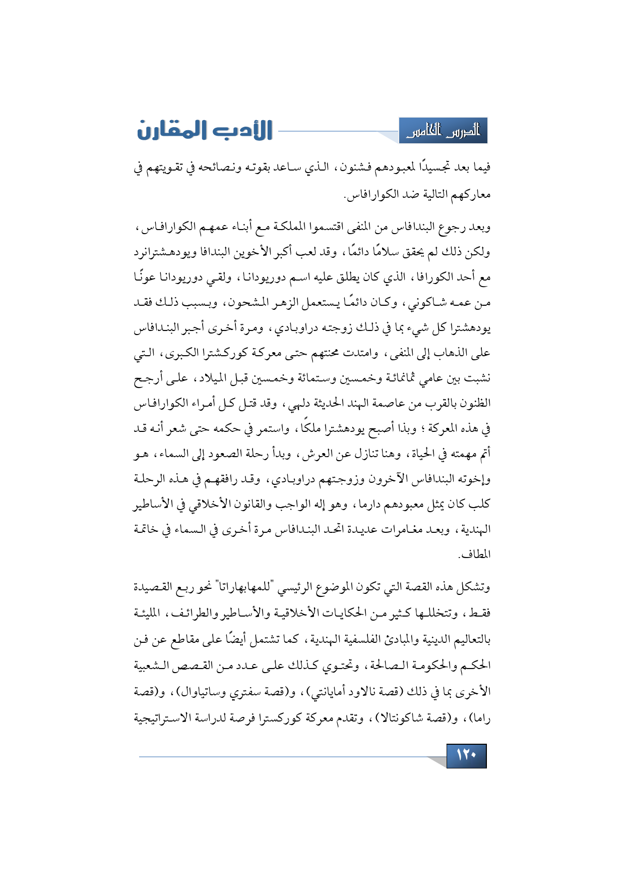 وتشكل هذه القصة التي تكون الموضوع الرئيسي "للمهابهاراتا" نحو ربع القصيدة فقط، وتتخللها كثير من الحكايات الأخلاقية والأساطير والطرائف، المليئة بالتعاليم الدينية والمبادئ الفلسفية الهندية، كما تشتمل أيضًا على مقاطع على مقاطع عن فن الحكم والحكومة الصالحة، وتحتوي كذلك على عدد من القصص الشعبية الأخرى بما في ذلك (قصة نالاود أمايانتي)، و (قصة سفتري وساتياوال)، و (قصة راما)، و (قصة شاكونتالا)، وتقدم معركة كوركسترا فرصة لدراسة الاستراتيجية
