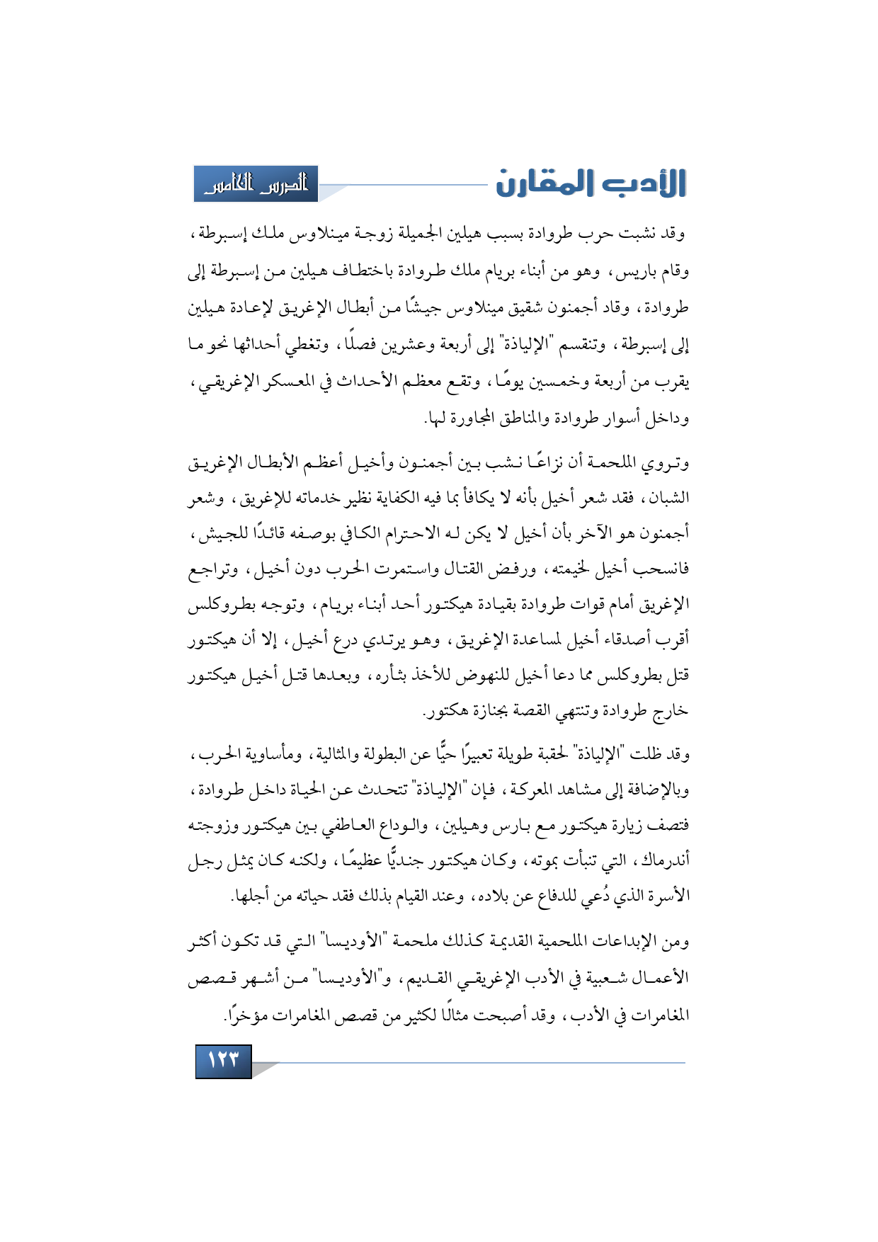 وقد ظلت "الإلياذة" لحقبة طويلة تعبيرًا حيًّا عن البطولة والمثالية، ومأساوية الحرب، وبالإضافة إلى مشاهد المعركة، فإن "الإلياذة" تتحدث عن الحياة داخل طروادة، فتصف زيارة هيكتور مع بارس وهيلين، والوداع العاطفي بين هيكتور وزوجته أندرماك، التي تنبأت بموته، وكان هيكتور جنديًّا عظيمًا، ولكنه كان يمثل رجل الأسرة الذي دُعي للدفاع عن بلاده، وعند القيام بذلك فقد حياته من أجلها.