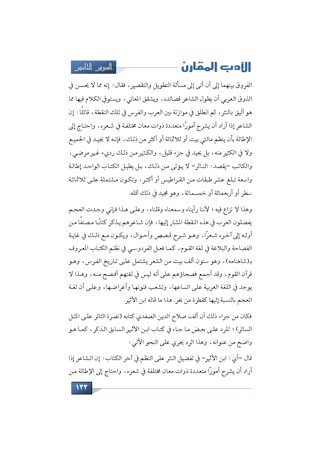وهذا لا نزاع فيه؛ لأننا رأيناه وسمعناه وقلناه، وعلى هذا فإني وجدت العجم يفضلون العرب في هذه النقطة المشار إليها، فإن شاعرهم يذكر كتابًا مصنفًا من أوله إلى آخره شعرًا، وهو شرح قصص وأحوال، ويكون مع ذلك في غاية الفصاحة والبلاغة في لغة القوم، كما فعل الفردوسي في نظم الكتاب المعروف بـ (شاهنامه)، وهو ستون ألف بيت من الشعر يشتمل على تاريخ الفرس، وهو قرآن القوم، وقد أجمع فصحاؤهم على أنه ليس في لغتهم أفصح منه، وهذا لا يوجد في اللغة العربية على اتساعها، وتشعب فنونها وأغراضها، وعلى أن لغة العجم بالنسبة إليها كقطرة من بحر. هذا ما قاله ابن الأثير.
