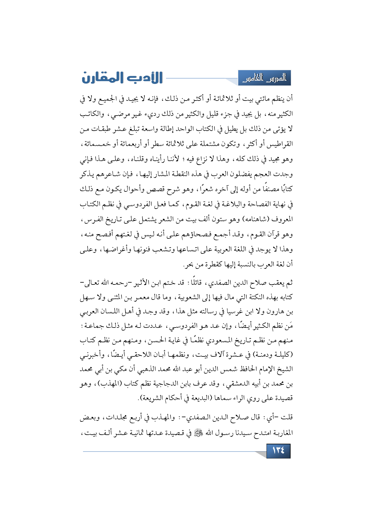 ثم يعقب صلاح الدين الصفدي، قائلًا: قد ختم ابن الأثير -رحمه الله تعالى- كتابه بهذه النكتة التي مال فيها إلى الشعوبية، وما قال معمر بن المثنى ولا سهل بن هارون ولا ابن غرسيا في رسالته مثل هذا، وقد وجد في أهل اللسان العربي مَن نظم الكثير أيضًا، وإن عد هو الفردوسي عددت له مثل ذلك جماعة: منهم من نظم تاريخ المسعودي نظمًا في غاية الحسن، ومنهم من نظم كتاب (كليلة ودمنة) في عشرة آلاف بيت، ونظمها أبان اللاحقي أيضًا، وأخبرني الشيخ الإمام الحافظ شمس الدين أبو عبد الله محمد الذهبي أن مكي بن أبي محمد بن محمد بن أبيه الدمشقي، وقد عرف بابن الدجاجية نظم كتاب (المهذب)، وهو قصيدة على روي الراء سماها (البديعة في أحكام الشريعة).