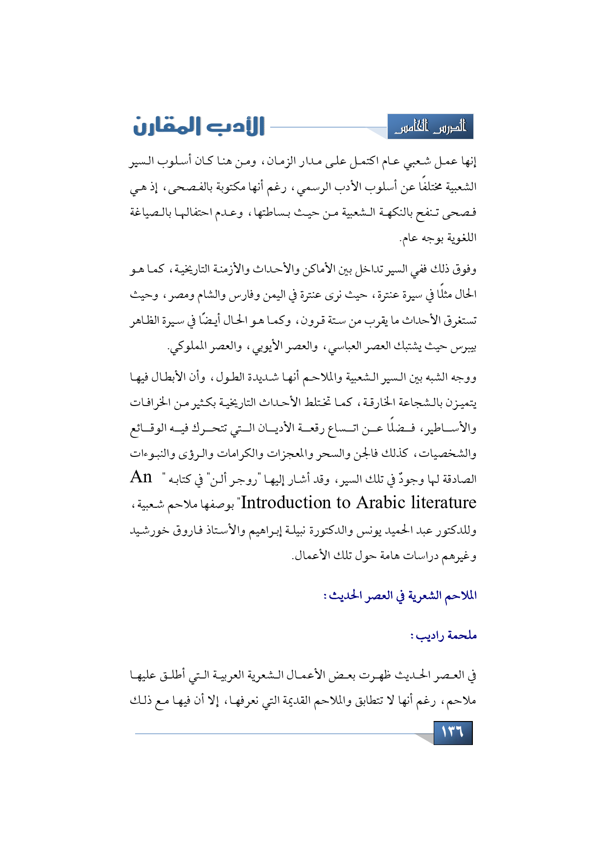 ووجه الشبه بين السير الشعبية والملاحم أنها شديدة الطول، وأن الأبطال فيها يتميزن بالشجاعة الخارقة، كما تختلط الأحداث التاريخية بكثير من الخرافات والأساطير، فضلًا عن اتساع رقعة الأديان التي تتحرك فيه الوقائع والشخصيات، كذلك فالجن والسحر والمعجزات والكرامات والرؤى والنبوءات الصادقة وجودٌ في تلك السير، وقد أشار إليها "روجر ألن" في كتابه " An Introduction to Arabic literature" بوصفها ملاحم شعبية، وللدكتور عبد الحميد يونس ودكتور نبيلة إبراهيم والأستاذ فاروق خورشيد وغيرهم دراسات هامة حول تلك الأعمال.