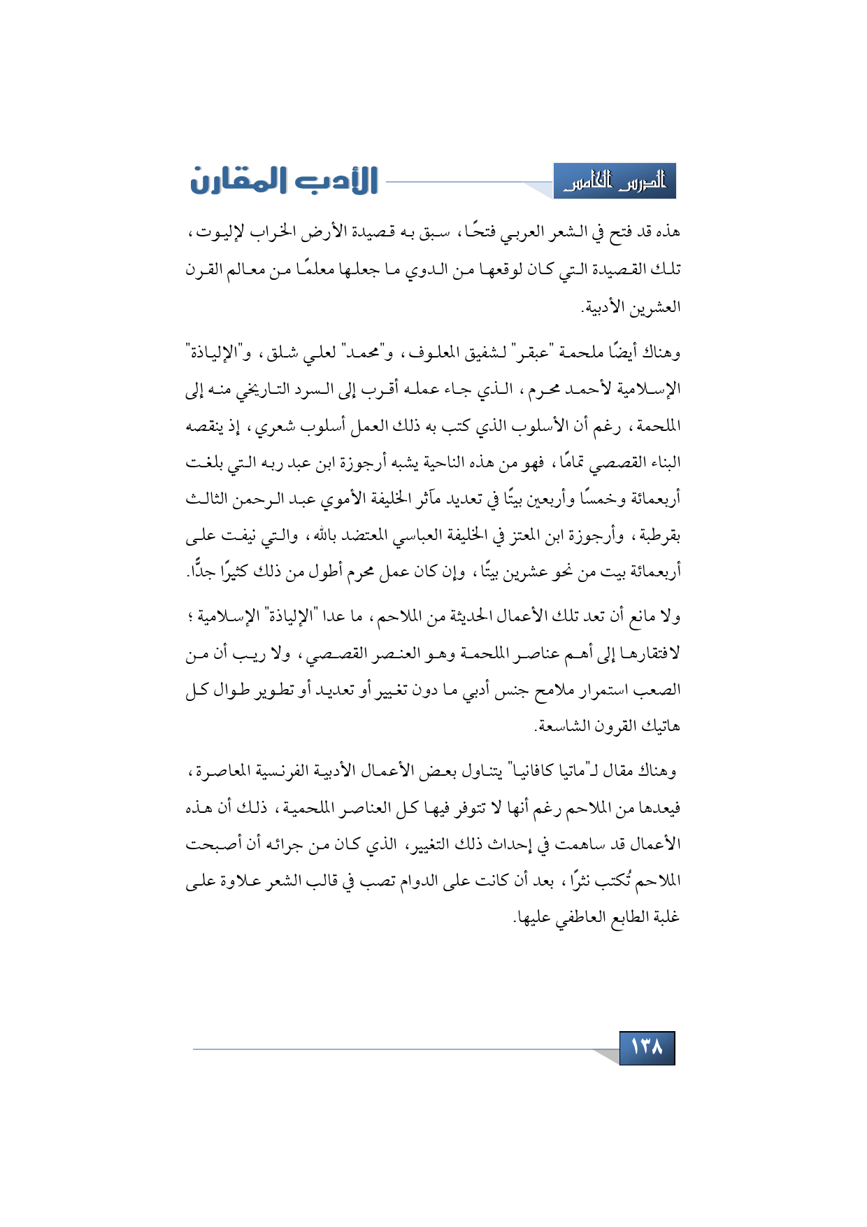 ولا مانع أن تعد تلك الأعمال الحديثة من الملاحم، ما عدا "الإلياذة" الإسلامية؛ لافتقارها إلى أهم عناصر الملحمة وهو العنصر القصصي، ولا ريب أن من الصعب استمرار ملامح جنس أدبي ما دون تغيير أو تعديد أو تطوير طوال كل هاتيك القرون الشاسعة، وهناك مقال لـ"ماتيا كافانيا" يتناول بعض الأعمال الأدبية الفرنسية المعاصرة، فيعدها من الملاحم رغم أنها لا تتوفر فيها كل العناصر الملحمية، ذلك أن هذه الأعمال قد ساهمت في إحداث ذلك التغيير، الذي كان من جرائه أن أصبحت الملاحم تُكتب نثرًا، بعد أن كانت على الدوام تصب في قالب الشعر علاوة على غلبة الطابع العاطفي عليها.