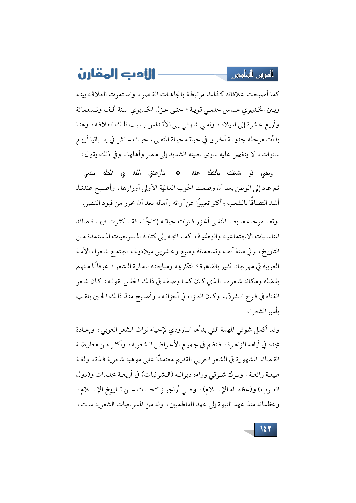 وقد أكمل شوقي المهمة التي بدأها البارودي لإحياء تراث الشعر العربي، وإعادة مجده في أيامه الزاهرة، فنظم في جميع الأغراض الشعرية، وأكثر من معارضة القصائد المشهورة في الشعر العربي القديم معتمدًا على موهبة شعرية فذة، ولغة طيعة رائعة، وترك شوقي وراءه ديوانه (الشوقيات) في أربعة مجلدات و (دول العرب) و (عظماء الإسلام)، وهي أراجيز تتحدث عن تاريخ الإسلام وعظمائه منذ عهد النبوة إلى عهد الفاطميين، وله من المسرحيات الشعرية ست