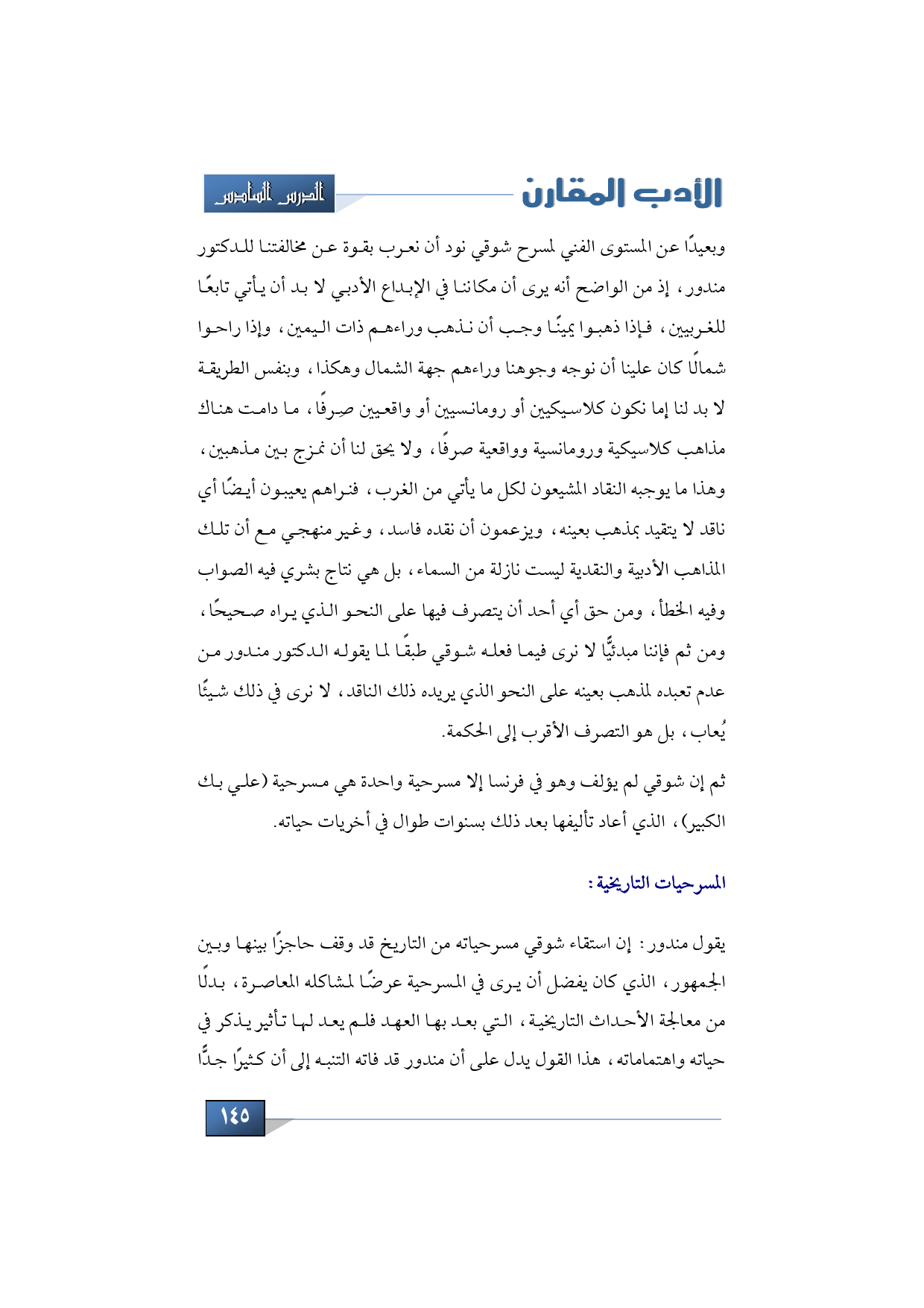 وبعيدًا عن المستوى الفني لمسرح شوقي نود أن نعرب بقوة عن مخالفتنا للدكتور مندور، إذ من الواضح أنه يرى أن مكاننا في الإبداع الأدبي لا بد أن يأتي تابعًا للغربيين، فإذا ذهبوا يمينًا وجب أن نذهب وراءهم ذات اليمين، وإذا راحوا شمالًا كان علينا أن نوجه وجوهنا وراءهم جهة الشمال وهكذا، وبنفس الطريقة لا بد لنا إما نكون إما كلاسيكيين أو رومانسيين أو واقعيين صِرفًا، ما دامت هناك مذاهب كلاسيكية ورومانسية وواقعية صرفًا، ولا يحق لنا أن نمزج بين مذهبين، وهذا ما يوجبه النقاد المشيعون لكل ما يأتي من الغرب، فنراهم يعيبون أيضًا أي ناقد لا يتقيد بمذهب بعينه، ويزعمون أن نقده فاسد، وغير منهجي مع أن تلك المذاهب الأدبية والنقدية ليست نازلة من السماء، بل هي نتائج بشري فيه الصواب وفيه الخطأ، ومن حق أي أحد أن يتصرف فيها على النحو الذي يراه صحيحًا، ومن ثم فإننا مبدئيًّا لا نرى فيما فعله شوقي طبقًا لما يقوله الدكتور مندور من عدم تعبده لمذهب بعينه على النحو الذي يريده ذلك الناقد، لا نرى في ذلك شيئًا يُعاب، بل هو التصرف الأقرب إلى الحكمة.