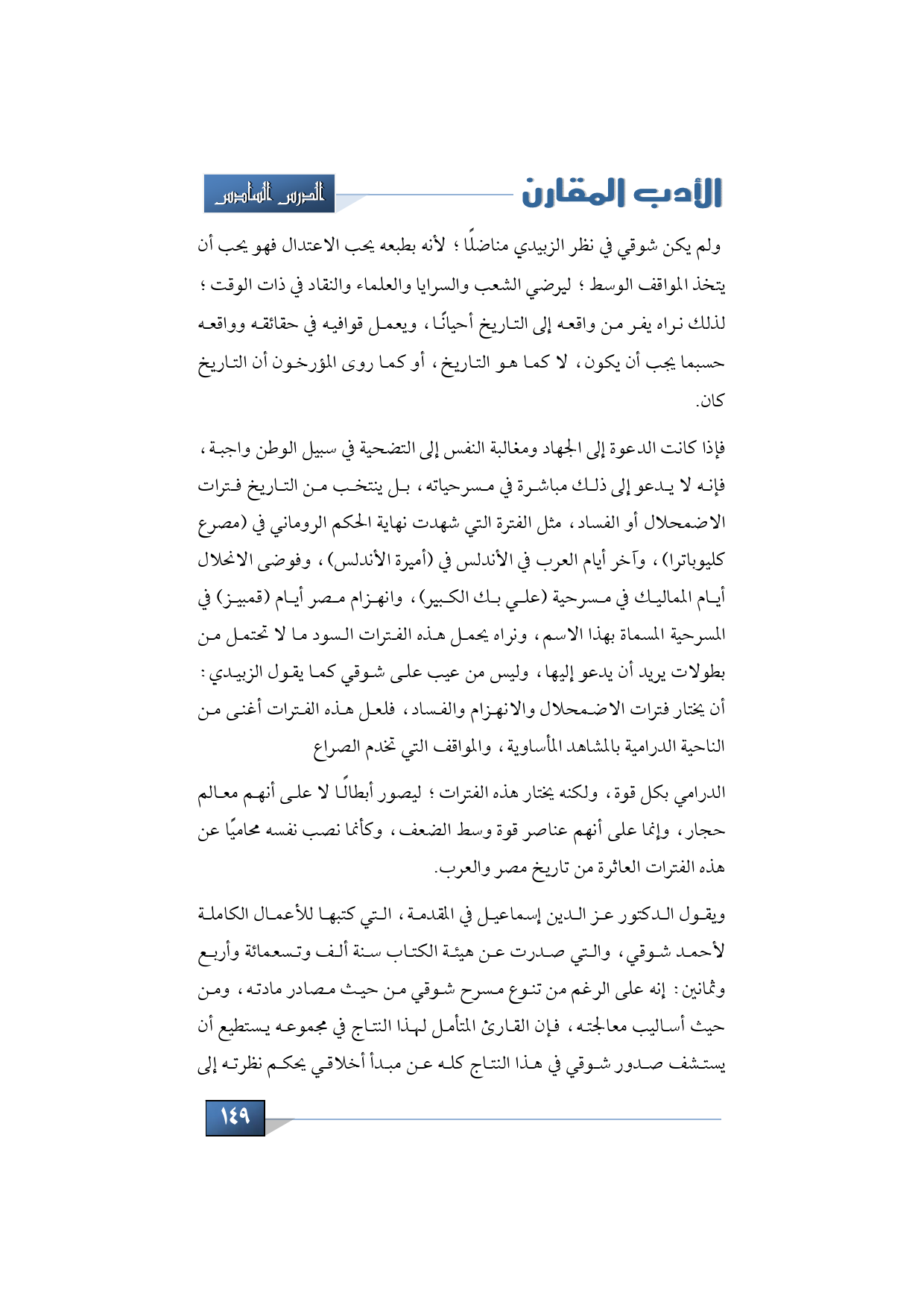 ولم يكن شوقي في نظر الزبيدي مناضلًا؛ لأنه بطبعه يحب الاعتدال فهو يحب أن يتخذ المواقف الوسط؛ ليرضي الشعب والسرايا والعلماء والنقاد في ذات الوقت؛ لذلك نراه يفر من واقعه إلى التاريخ أحيانًا، ويعمل قوافيه في حقائقه وواقعه حسبما يجب أن يكون، لا كما هو التاريخ، أو كما روى المؤرخون أن التاريخ كان.