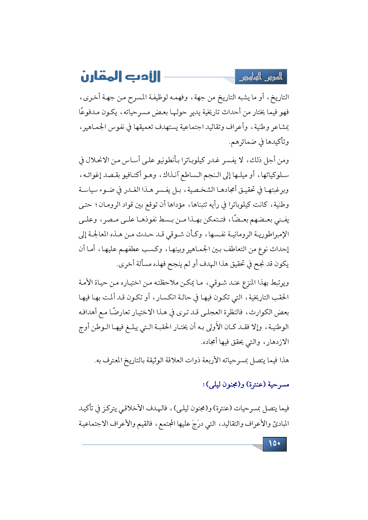 أما فيما يتصل بمسرحيات (عنترة) و (مجنون ليلى)، فالهدف الأخلاقي يتركز في تأكيد المبادئ والأعراف والتقاليد، التي درَجَ عليها المجتمع، فالقيم والأعراف الاجتماعية