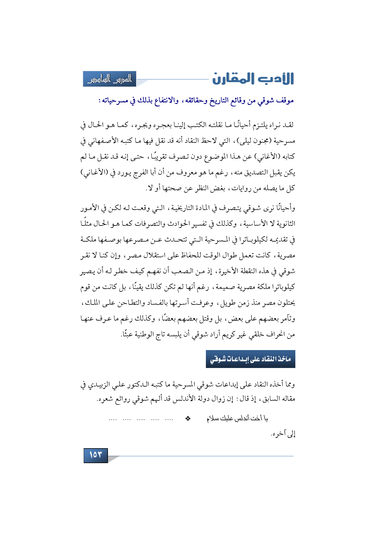 وقد ذكر الأستاذ رفعت سلَّام هذا الكلام في كتابه (المسرح الشعري العربي) الصادر في سلسلة المكتبة الثقافية في مصر، وبالنسبة لموقف شوقي من وقائع التاريخ وحقائقه، والانتفاع بذلك في مسرحياته نراه يلتزم أحيانًا ما نقلته الكتب إلينا بعجره وبجره، كما هو الحال في مسرحية (مجنون ليلى)، التي لاحظ النقاد أنه قد نقل النقاد أنه قد نقل فيها ما كتبه الأصفهاني في كتابه (الأغاني) عن هذا الموضوع دون تصرف تقريبًا، حتى إنه قد نقل ما لم يكن يقبل التصديق منه، رغم ما هو معروف من أن أبا الفرج يورد في (الأغاني) كل ما يصله من روايات، بغض النظر عن صحتها أو لا.