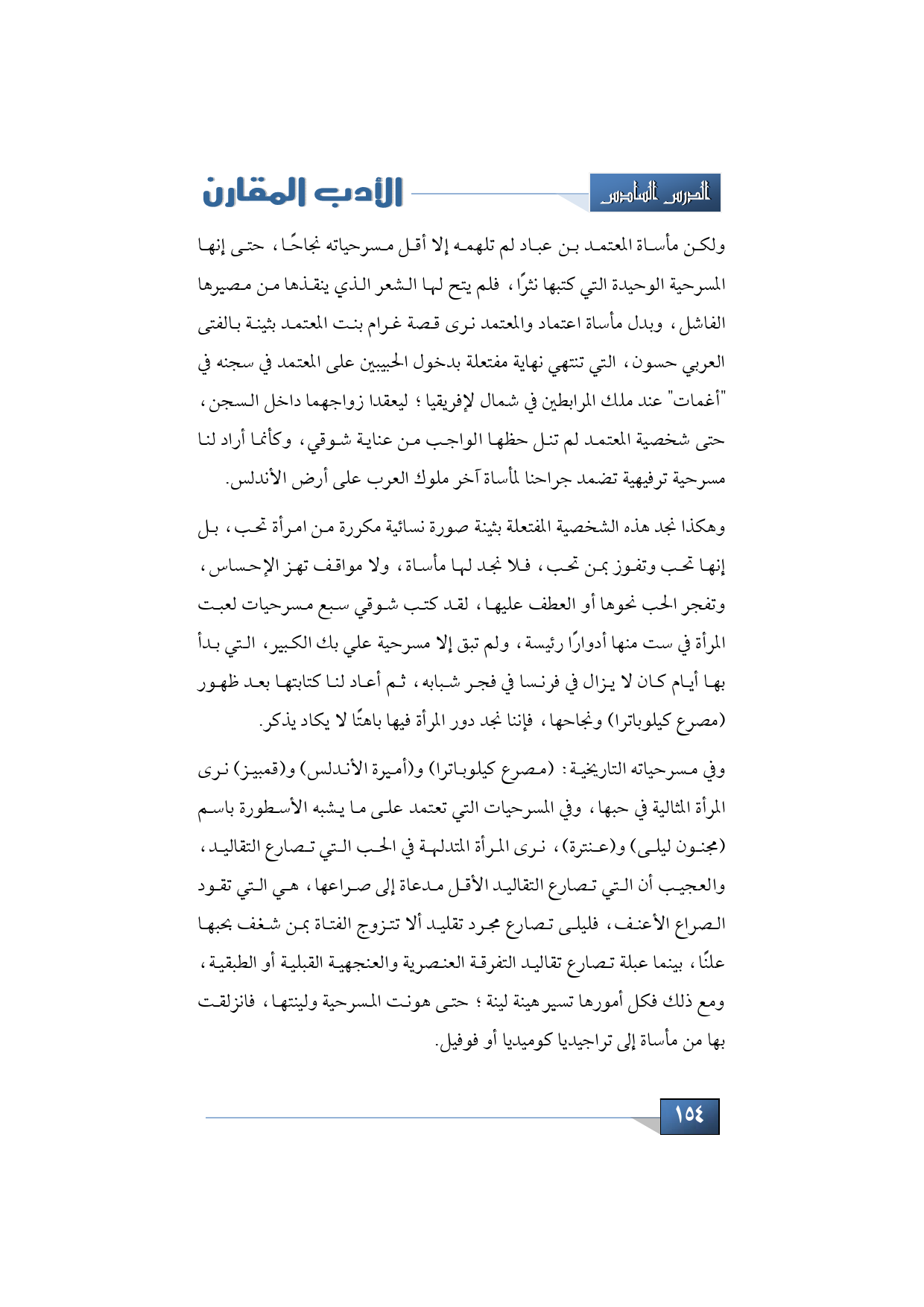 وفي مسرحياته التاريخية (مصرع كيلوباترا) و (أميرة الأندلس) و (قمبيز) نرى المرأة المثالية في حبها، وفي المسرحيات التي تعتمد على ما يشبه الأسطورة باسم (مجنون ليلى) و (عنترة)، نرى المرأة المتدلهة في الحب التي تصارع التقاليد، والعجيب أن التي تصارع التقاليد الأقل مدعاة إلى صراعها هي التي تقود الصراع الأعنف، فليلى تصارع مجرد تقليد ألا تتزوج الفتاة بمن شغف بحبها علنًا، بينما عبلة تصارع تقاليد التفرقة العنصرية والعنجهية القبلية أو الطبقية، ومع ذلك فكل أمورها تسير هينة لينة؛ حتى هونت المسرحية ولينتها، فانزلقت بها من مأساة إلى تراجيديا كوميديا أو فوفيل.