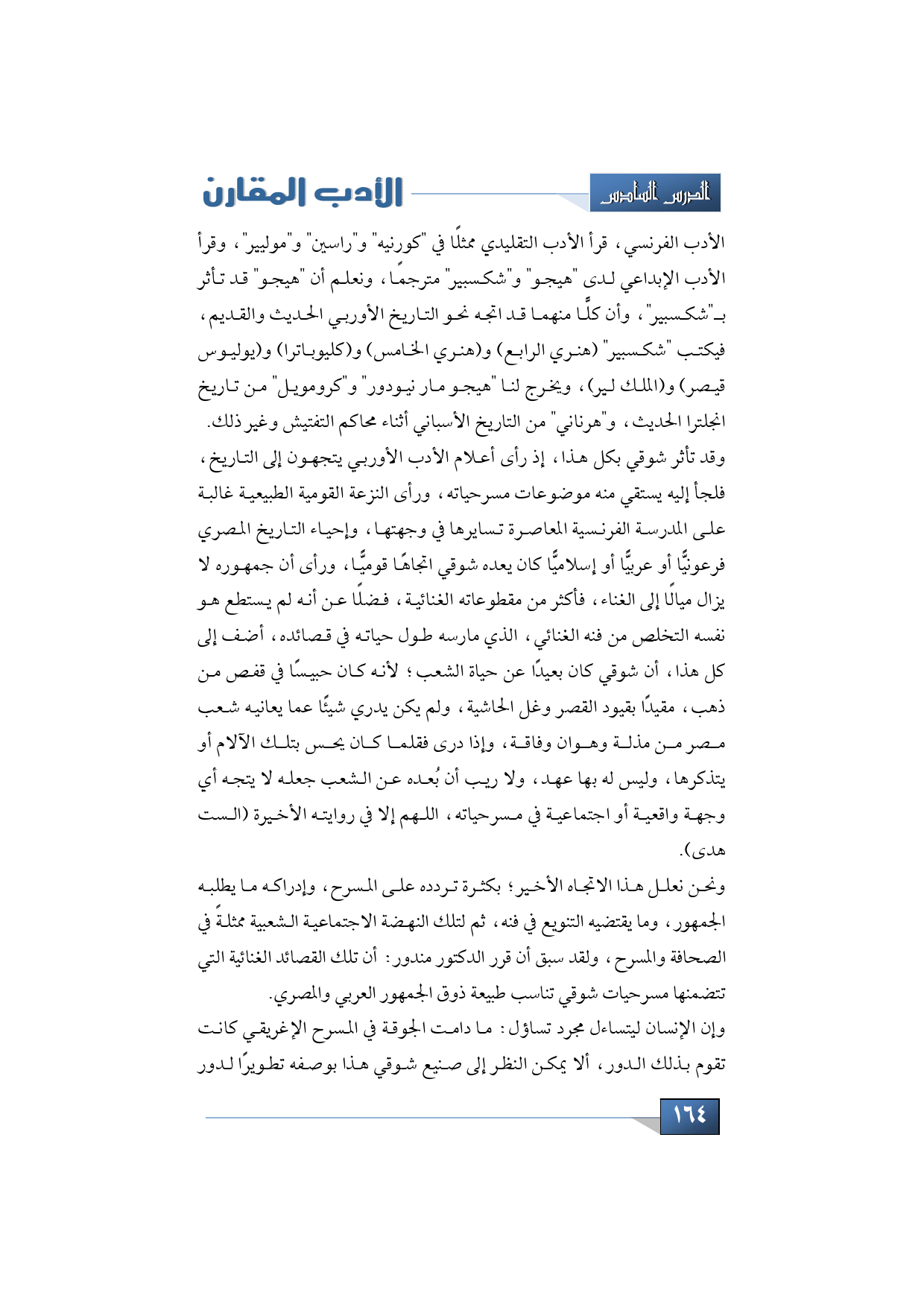 ونحن نعلل هذا الاتجاه الأخير بكثرة تردده على المسرح وإدراكه ما يطلبه الجمهور، وما يقتضيه التنويع في فنه، ثم لتلك النهضة الاجتماعية الشعبية ممثلةً في الصحافة والمسرح، ولقد سبق أن سمعنا الدكتور مندور يقرر أن تلك القصائد الغنائية التي تتضمنها مسرحيات شوقي تناسب طبيعة ذوق الجمهور العربي والمصري.