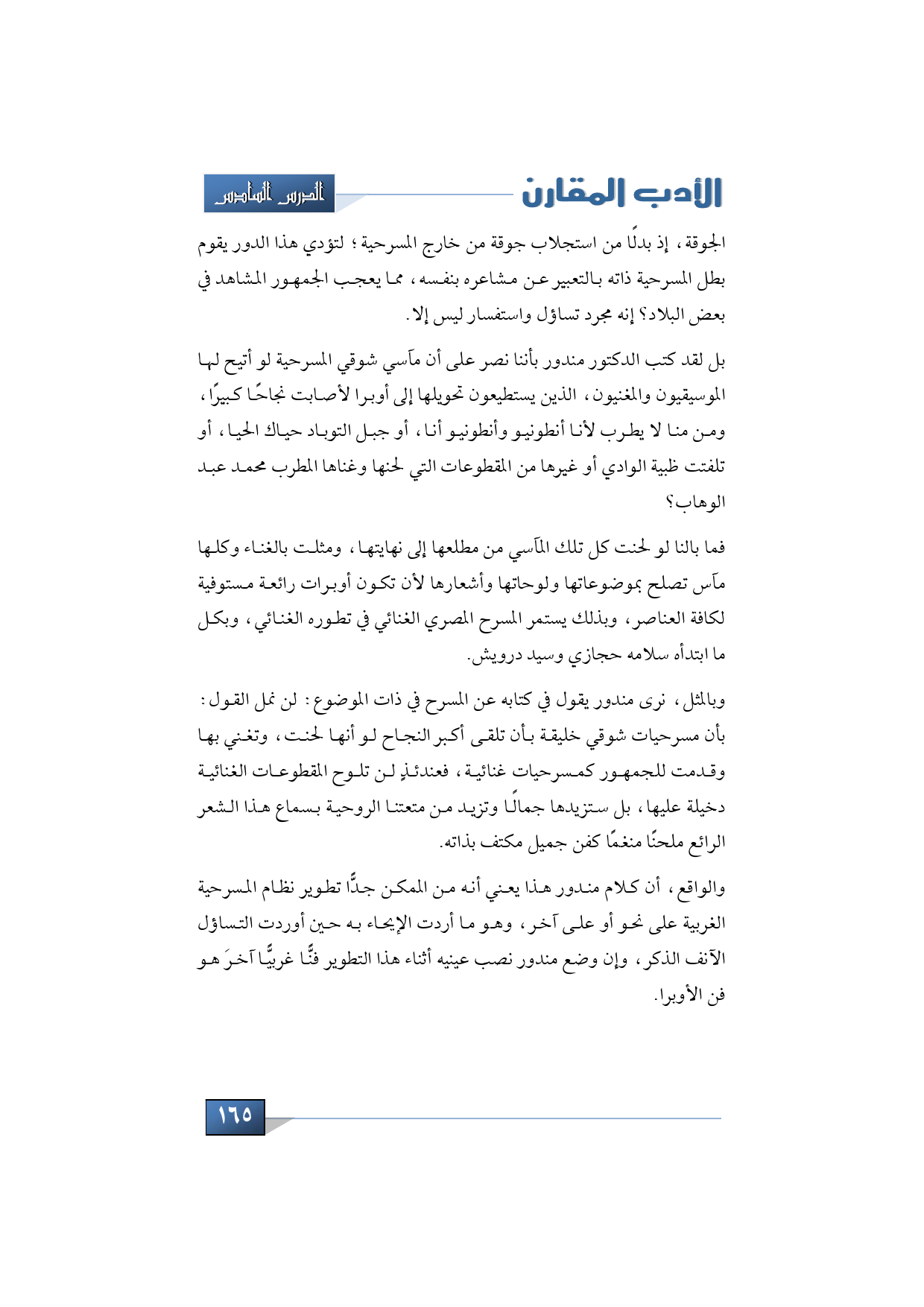 وبالمثل نرى مندور يقول في كتابه عن المسرح في ذات الموضوع: لن نمل القول: بأن مسرحيات شوقي خليقة بأن تلقى أكبر النجاح لو أنها لحنت، وتغني بها وقدمت للجمهور كمسرحيات غنائية، فعندئذٍ لن تلوح المقطوعات الغنائية دخيلة عليها، بل ستزيدها جمالًا وتزيد من متعتنا الروحية بسماع هذا الشعر الرائع ملحنًا منغمًا كفن جميل مكتف بذاته.