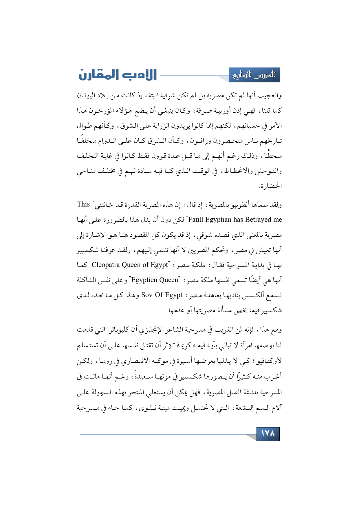 ولقد سماها أنطونيو بالمصرية، إذ قال: إن هذه المصرية القذرة قد خانتني " This Faull Egyptian has Betrayed me" لكن دون أن يدل هذا بالضرورة على أنها مصرية بالمعنى الذي قصده شوقي، إذ قد يكون كل المقصود هنا هو الإشارة إلى أنها تعيش في مصر، وتحكم المصريين لا أنها تنتمي إليهم، ولقد عرفنا شكسبير بها في بداية المسرحية فقال: ملكة مصر: " Cleopatra Queen of Egypt" كما أنها هي أيضًا تسمي نفسها ملكة مصر: " Egyptien Queen " وعلى نفس الشاكلة نسمع ألكسس يناديها بعاهلة مصر: Sov Of Egypt وهذا كل ما نجده لدى شكسبير فيما يخص مسألة مصريتها أو عدمها.