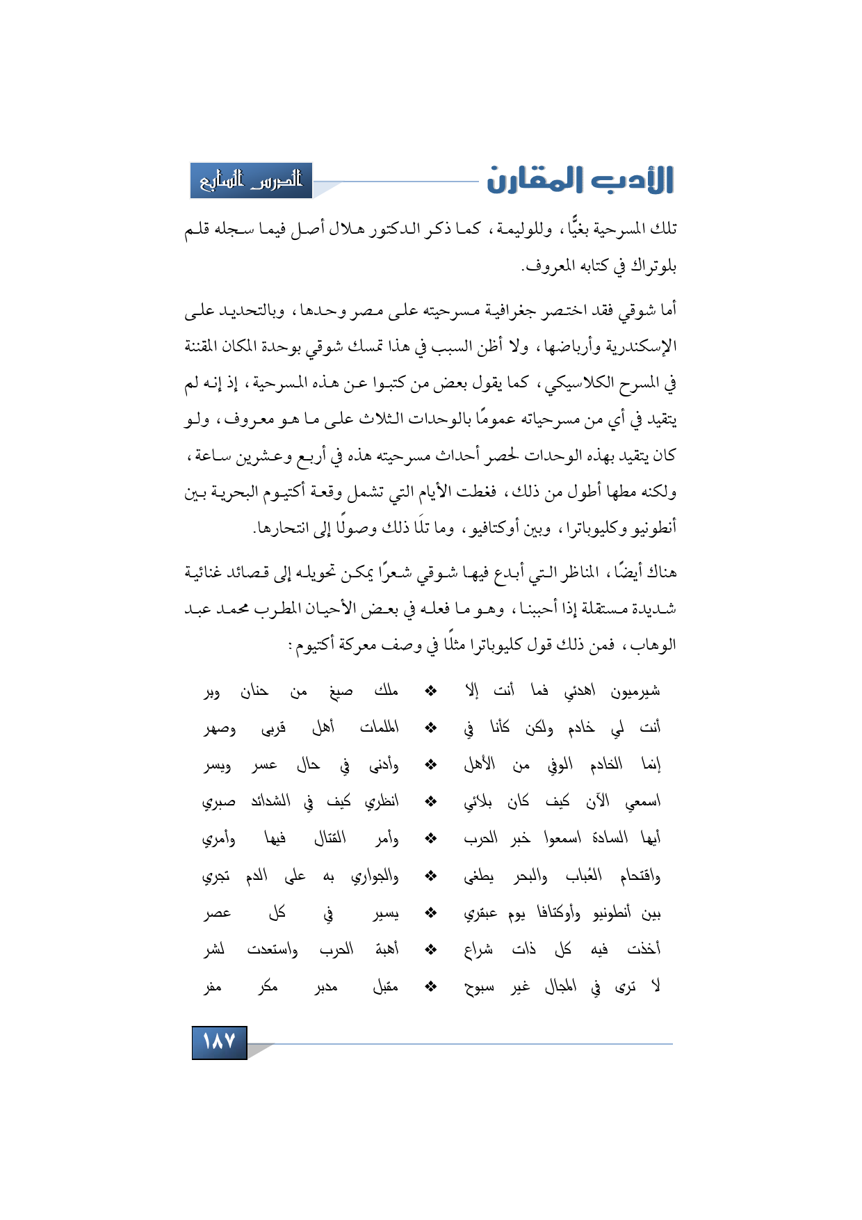 هناك أيضًا المناظر التي أبدع فيها شوقي شعرًا يمكن تحويله إلى قصائد غنائية شديدة مستقلة إذا أحببنا، وهو ما فعله في بعض الأحيان المطرب محمد عبد الوهاب، فمن ذلك قول كليوباترا مثلًا في وصف معركة أكتيوم: