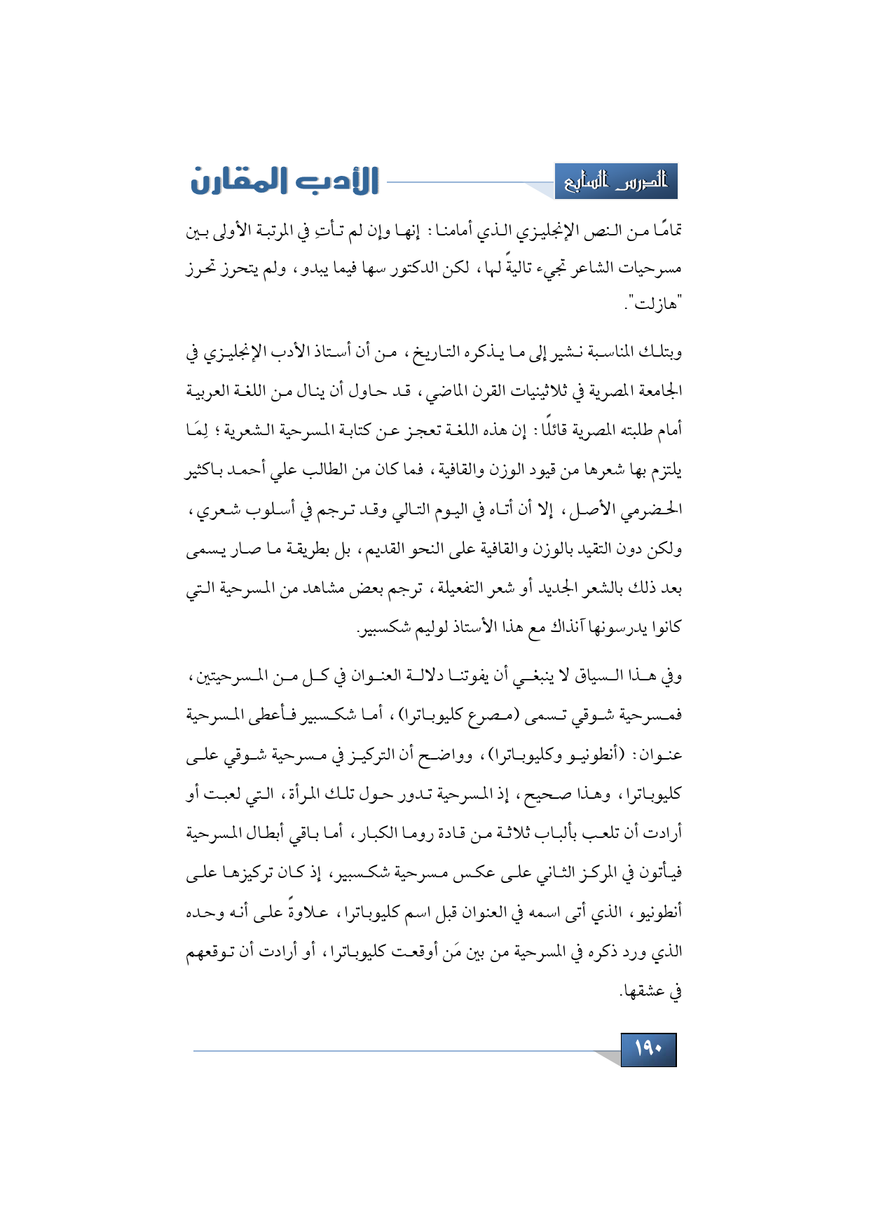 تمامًا من النص الإنجليزي الذي أمامنا: إنها وإن لم تأتِ في المرتبة الأولى بين مسرحيات الشاعر تجيء تاليةً لها، لكن الدكتور ماضي سها فيما يبدو، ولم يتحرز تحرز "هازلت".