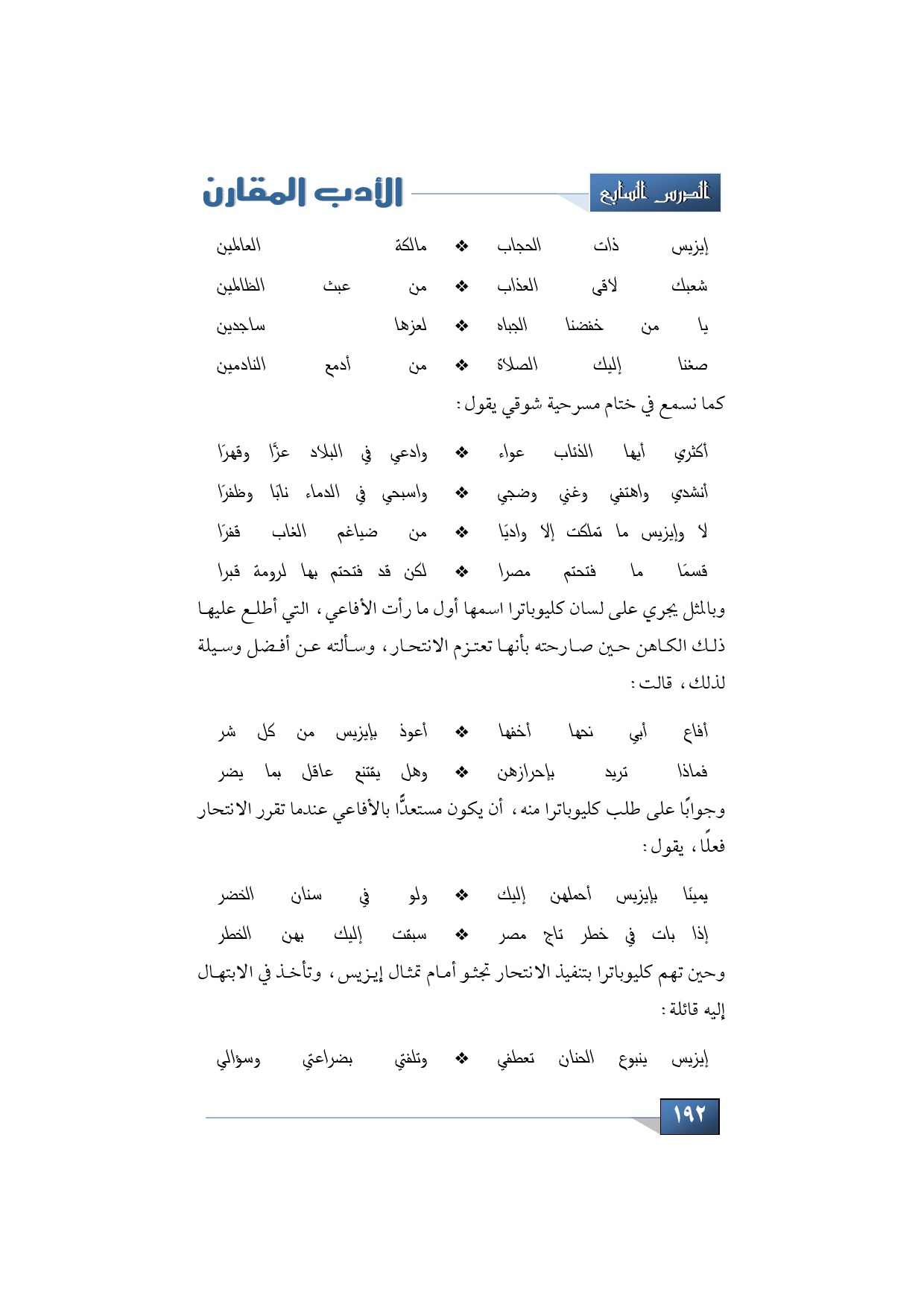 وحين تهم كليوباترا بتنفيذ الانتحار تجثو أمام تمثال إيزيس، وتأخذ في الابتهال إليه قائلة: