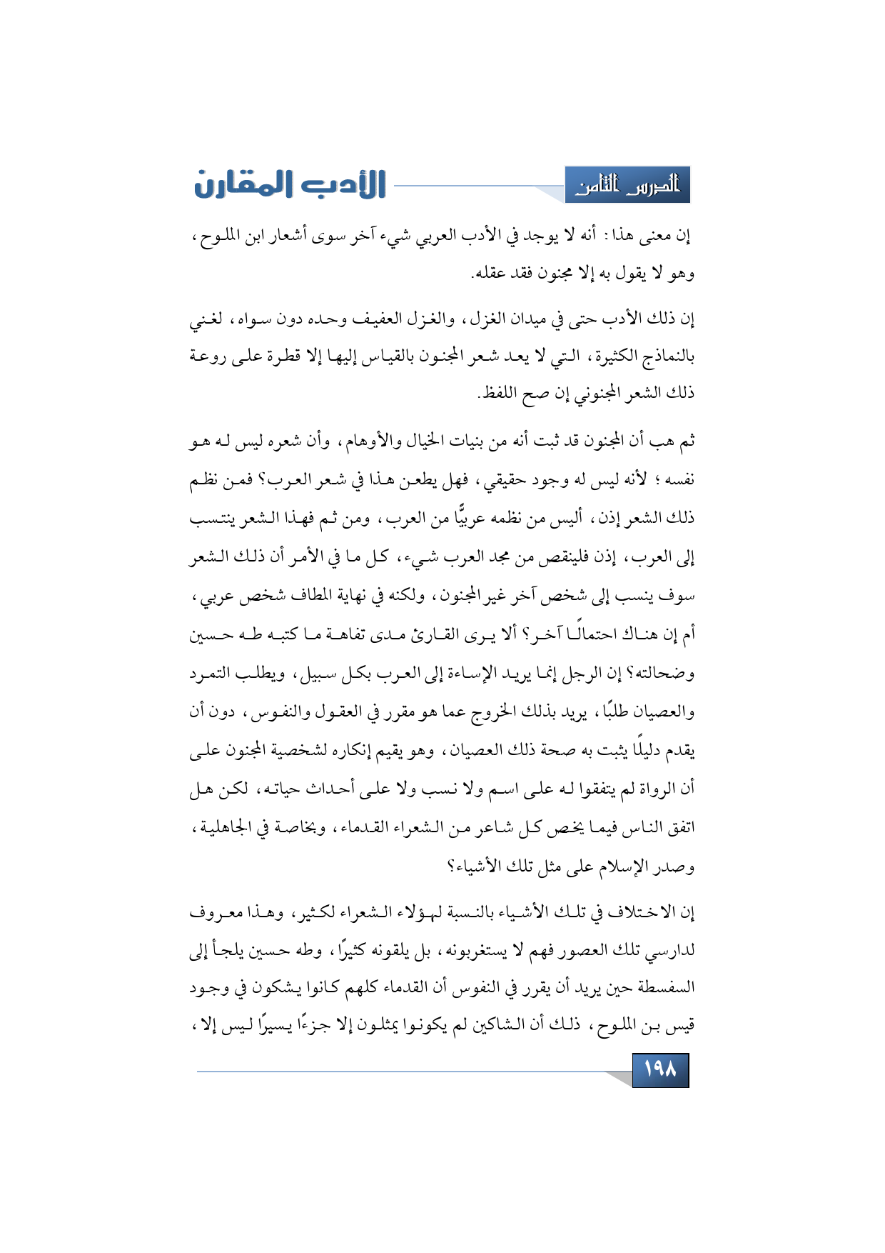 إن معنى هذا أنه لا يوجد في الأب العربي شيء آخر سوى أشعار ابن الملوح، وهو ما يقول به إلا مجنون فقد عقله.