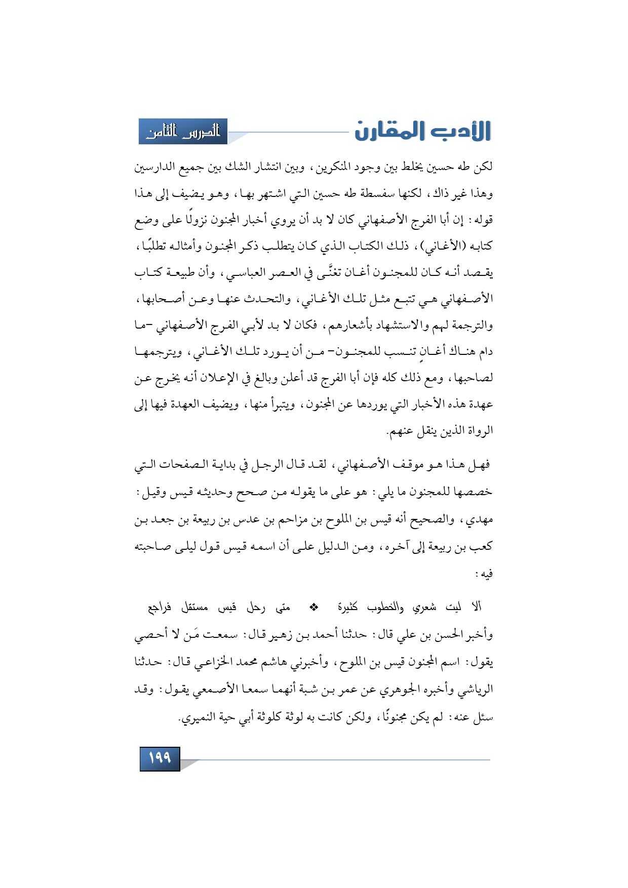 لكن طه حسين يخلط بين وجود المنكرين، وبين انتشار الشك بين جميع الدارسين وهذا غير ذاك، لكنها سفسطة طه حسين التي اشتهر بها، وهو يضيف إلى هذا قوله: إن أبا الفرج الأصفهاني كان لا بد أن يروي أخبار المجنون نزولًا على وضع كتابه (الأغاني) ذلك الكتاب الذي كان يتطلب ذكر المجنون وأمثاله تطلبًا، يقصد أنه كان للمجنون أغان تغنَّى في العصر العباسي، وأن طبيعة كتاب الأصفهاني هي تتبع مثل تلك الأغاني، والتحدث عنها وعن أصحابها، والترجمة لهم والاستشهاد بأشعارهم، فكان لا بد لأبي الفرج الأصفهاني ما دام هناك أغانٍ تنسب للمجنون من أن يريد تلك الأغاني، ويترجمها لصاحبها، ومع ذلك كله فإن أبا الفرج قد أعلن وبالغ في الإعلان أنه يخرج عن عهدة هذه الأخبار التي يوردها عن المجنون، ويتبرأ منها، ويضيف العهدة فيها إلى الرواة الذين ينقل عنهم.