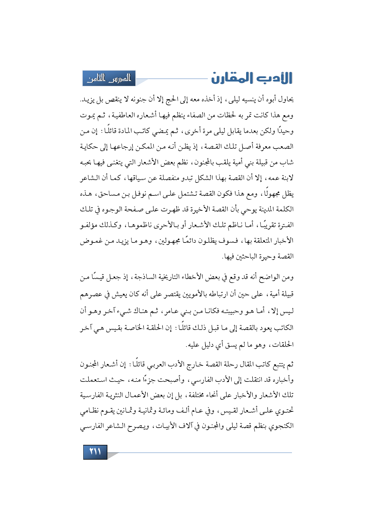 ثم يتتبع كاتب المقال رحلة القصة خارج الأدب العربي قائلًا: إن أشعار المجنون وأخباره قد انتقلت إلى الأدب الفارسي، وأصبحت جزءًا منه، حيث استعملت تلك الأشعار والأخبار على أنحاء مختلفة، بل إن بعض الأعمال النثرية الفارسية تحتوي على أشعار لقيس، وفي عام ألف ومائة وثمانية وثمانين يقوم نظامي الكنجوي بنظم قصة ليلى والمجنون في آلاف الأبيات، ويصرح الشاعر الفارسي