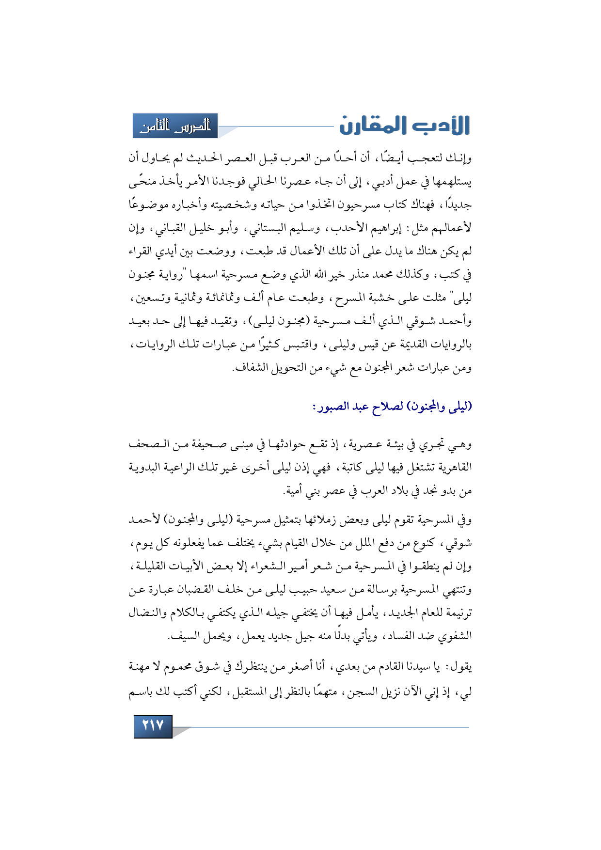 ومن عجائب الأقدار أيضًا أن أحدًا من العرب قبل العصر الحديث لم يحاول أن يستلهمها في عمل أدبي، إلى أن جاء عصرنا الحالي فوجدنا الأمر يأخذ منحًى جديدًا، فهناك كتاب مسرحيون اتخذوا من حياته وشخصيته وأخباره موضوعًا لأعمالهم مثل: إبراهيم الأحدب وسليم البستاني وأبو خليل القباني، وإن لم يكن هناك ما يدل على أن تلك الأعمال قد طبعت، ووضعت بين أيدي القراء في كتب، وكذلك محمد منذر خير الله الذي وضع مسرحية اسمها رواية مجنون ليلى مثلت على خشبة المسرح، وطبعت عام ألف وثمانمائة وثمانية وتسعين، ثم عندنا أحمد شوقي الذي ألف مسرحية (مجنون ليلى)، وتقيد فيها إلى حد بعيد بالروايات القديمة عن قيس وليلى واقتبس كثيرًا من عبارات تلك الروايات، ومن عبارات شعر المجنون مع شيء من التحويل الشفاف، ولدينا كذلك مسرحية لصلاح عبد الصبور اسمها (ليلى والمجنون)، وهي تجري في بيئة عصرية، إذ تقع حوادثها في مبنى صحيفة من الصحف القاهرية تشتغل فيها ليلى كاتبة، فهي إذن ليلى أخرى غير تلك الراعية البدوية من بدو نجد في بلاد العرب في عصر بني أمية.