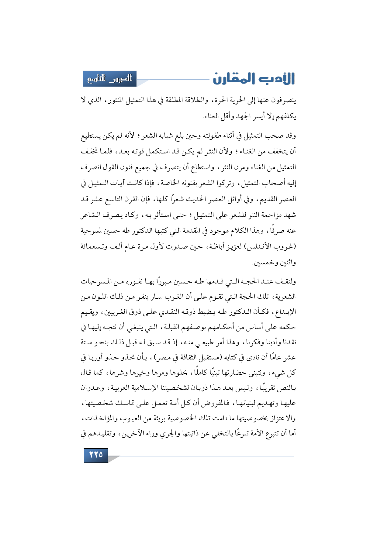 ويهمني ما دمنا في حقل الأدب المقارن أن نقف عند الحجة التي قدمها طه حسين مبررًا بها نفوره من المسرحيات الشعرية، تلك الحجة التي تقوم على أن الغرب سار ينفر من ذلك اللون من الإبداع، فكأن الدكتور طه يضبط ذوقه النقدي على ذوق الغربيين، ويقيم حكمه على أساس من أحكامهم بوصفهم القبلة، التي ينبغي أن نتجه إليها في نقدنا وأدبنا وفكرنا، وهذا أمر طبيعي منه، إذ قد سبق له قبل ذلك بنحو ستة عشر عامًا أن نادى في كتابه (مستقبل الثقافة في مصر)، بأن نحذو حذو أوربا في كل شيء، ونتبنى حضارتها تبنيًا كاملًا بحلوها ومرها وخيرها وشرها، كما قال بالنص تقريبًا، وليس بعد هذا ذوبان لشخصيتنا الإسلامية العربية، وعدوان عليها وتهديم لبنيانها، فالمفروض أن كل أمة تعمل على تماسك شخصيتها، والاعتزاز بخصوصيتها ما دامت تلك الخصوصية بريئة من العيوب والمؤاخذات، أما أن تتبرع الأمة تبرعًا بالتخلي عن ذاتيتها والجري وراء الآخرين، وتقليدهم في