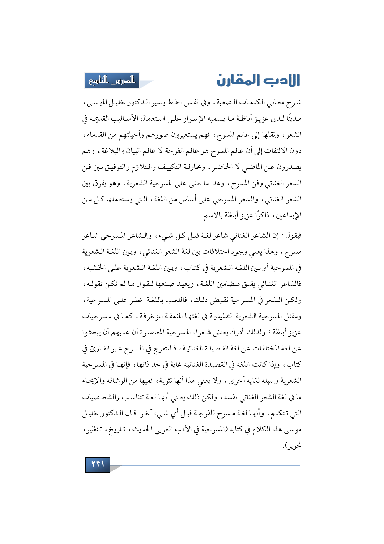 شرح معاني الكلمات الصعبة، وفي نفس الخط يسير الدكتور خليل الموسى مدينًا لدى عزيز أباظة ما يسميه الإسرار على استعمال الأساليب القديمة في الشعر، ونقلها إلى عالم المسرح، فهم يستعيرون صورهم وأخيلتهم من القدماء، دون الالتفات إلى أن عالم المسرح هو عالم الفرجة لا عالم البيان والبلاغة، وهم يصدرون عن الماضي لا الحاضر، ومحاولة التكييف والتلاؤم والتوفيق بين فن الشعر الغنائي وفن المسرح، وهذا ما جنى على المسرحية الشعرية، وهو يفرق بين الشعر الغنائي والشعر المسرحي على أساس من اللغة، التي يستعملها كل من الإبداعين ذاكرًا عزيز أباظة بالاسم.