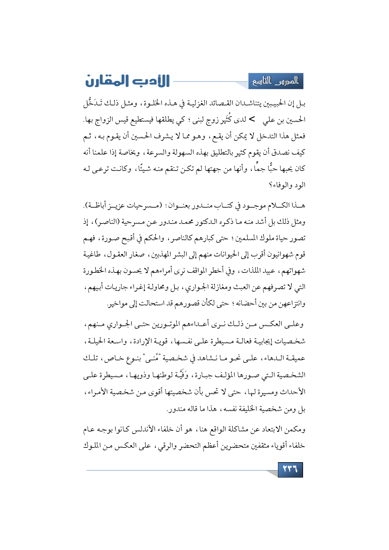 ومثل ذلك بل أشد منه ما ذكره الدكتور محمد مندور عن مسرحية (الناصر)، إذ تصور حياة ملوك المسلمين؛ حتى كبارهم كالناصر والحكم في أقبح صورة، فهم قوم شهوانيون أقرب إلى الحيوانات منهم إلى البشر المهذبين صغار العقول، طاغية شهواتهم، عبيد الملذات، وفي أخطر المواقف نرى أمراءهم لا يحسون بهذه الخطورة التي لا تصرفهم عن العبث ومغازلة الجواري، بل ومحاولة إغراء جاريات أبيهم، وانتزاعهن من بين أحضانه؛ حتى لكأن قصورهم قد استحالت إلى مواخير، وعلى العكس من ذلك نرى أعداءهم الموتورين حتى الجواري منهم، شخصيات إيجابية فعالة مسيطرة على نفسها، قوية الإرادة، واسعة الحيلة، عميقة الدهاء، على نحو ما نشاهد في شخصية "مُنى" بنوع خاص، تلك الشخصية التي صورها المؤلف جبارة، وَفَيَّة لوطنها وذويها، مسيطرة على الأحداث ومسيرة لها، حتى لا تحس بأن شخصيتها أقوى من شخصية الأمراء، بل ومن شخصية الخليفة نفسه، هذا ما قاله مندور.