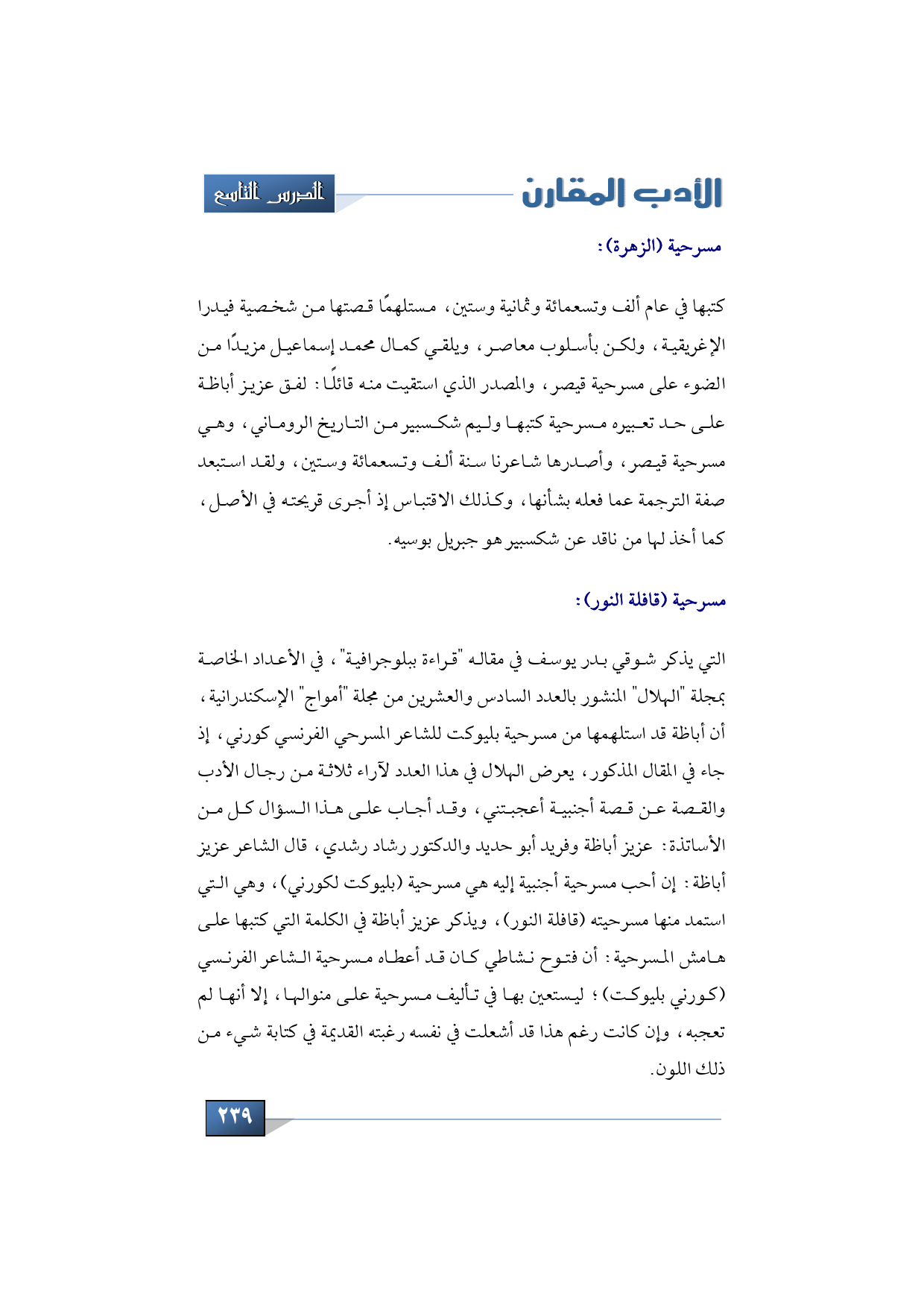 والمسرحية العاشرة والأخيرة في أعمال عزيز أباظة هي (الزهرة)، التي كتبها في عام ألف وتسعمائة وثمانية وستين مستلهمًا قصتها من شخصية فيدرا الإغريقية، ولكن بأسلوب معاصر، ويلقي كمال محمد إسماعيل مزيدًا من الضوء على مسرحية قيصر، والمصدر الذي استقيت منه قائلًا: لفق عزيز أباظة على حد تعبيره مسرحية كتبها وليم شكسبير من التاريخ الروماني، وهي مسرحية قيصر، وأصدرها شاعرنا سنة ألف وتسعمائة وستين، ولقد استبعد صفة الترجمة عما فعله بشأنها، وكذلك الاقتباس إذ أجرى قريحته في الأصل، كما أخذ لها من ناقد عن شكسبير هو جبريل بوسيه.