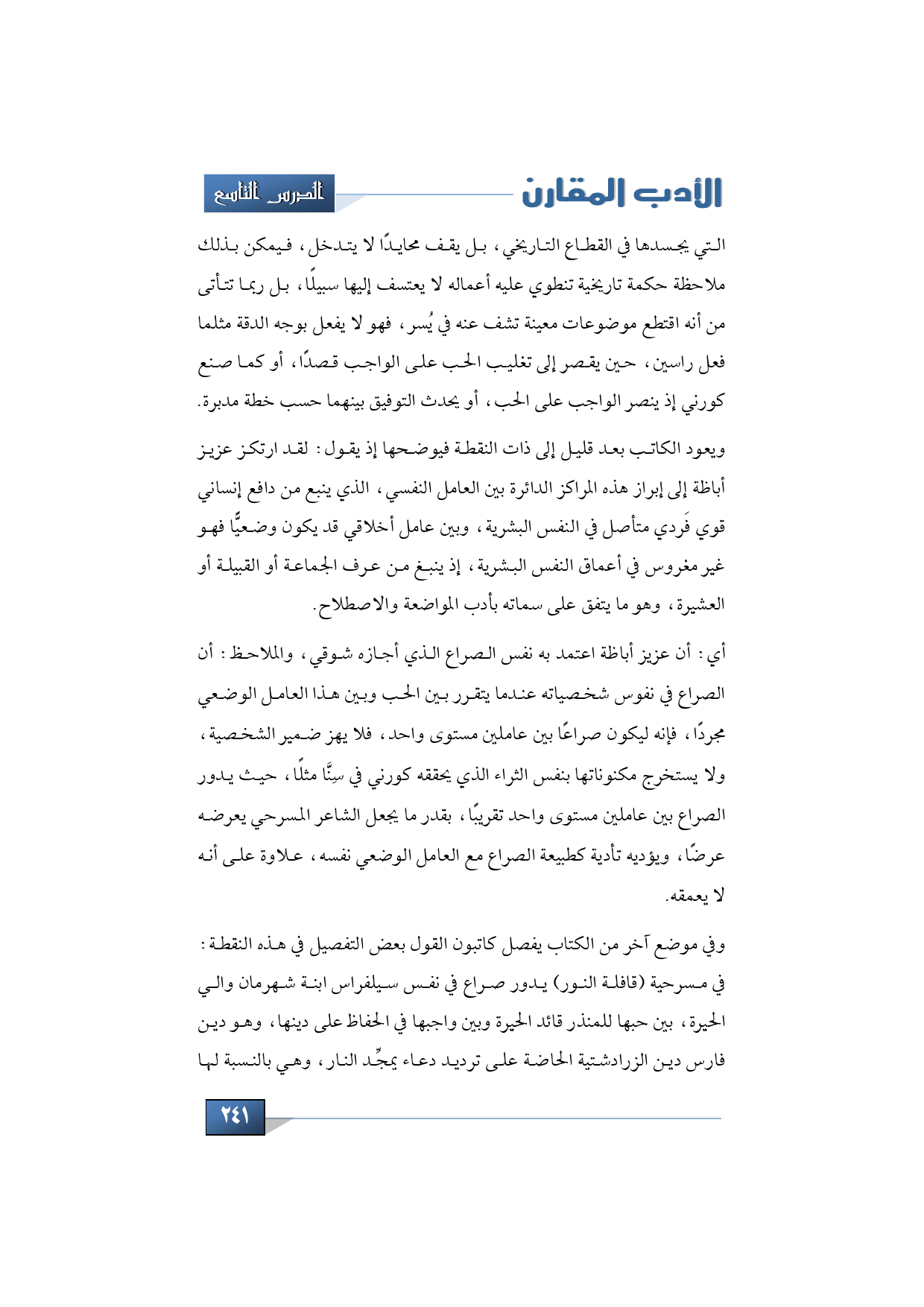 أي: أن عزيز أباظة اعتمد به نفس الصراع الذي أجازه شوقي، والملاحظ: أن الصراع في نفوس شخصياته عندما يتقرر بين الحب وبين هذا العامل الوضعي مجردًا، فإنه ليكون صراعًا بين عاملين مستوى واحد، فلا يهز ضمير الشخصية ولا يستخرج مكنوناتها بنفس الثراء الذي يحققه كورني في سِنَّا مثلًا، حيث يدور الصراع بين عاملين مستوى واحد تقريبًا بقدر ما يجعل الشاعر المسرحي يعرضه عرضًا، ويؤديه تأدية كطبيعة الصراع مع العامل الوضعي نفسه، علاوة على أنه لا يعمقه.