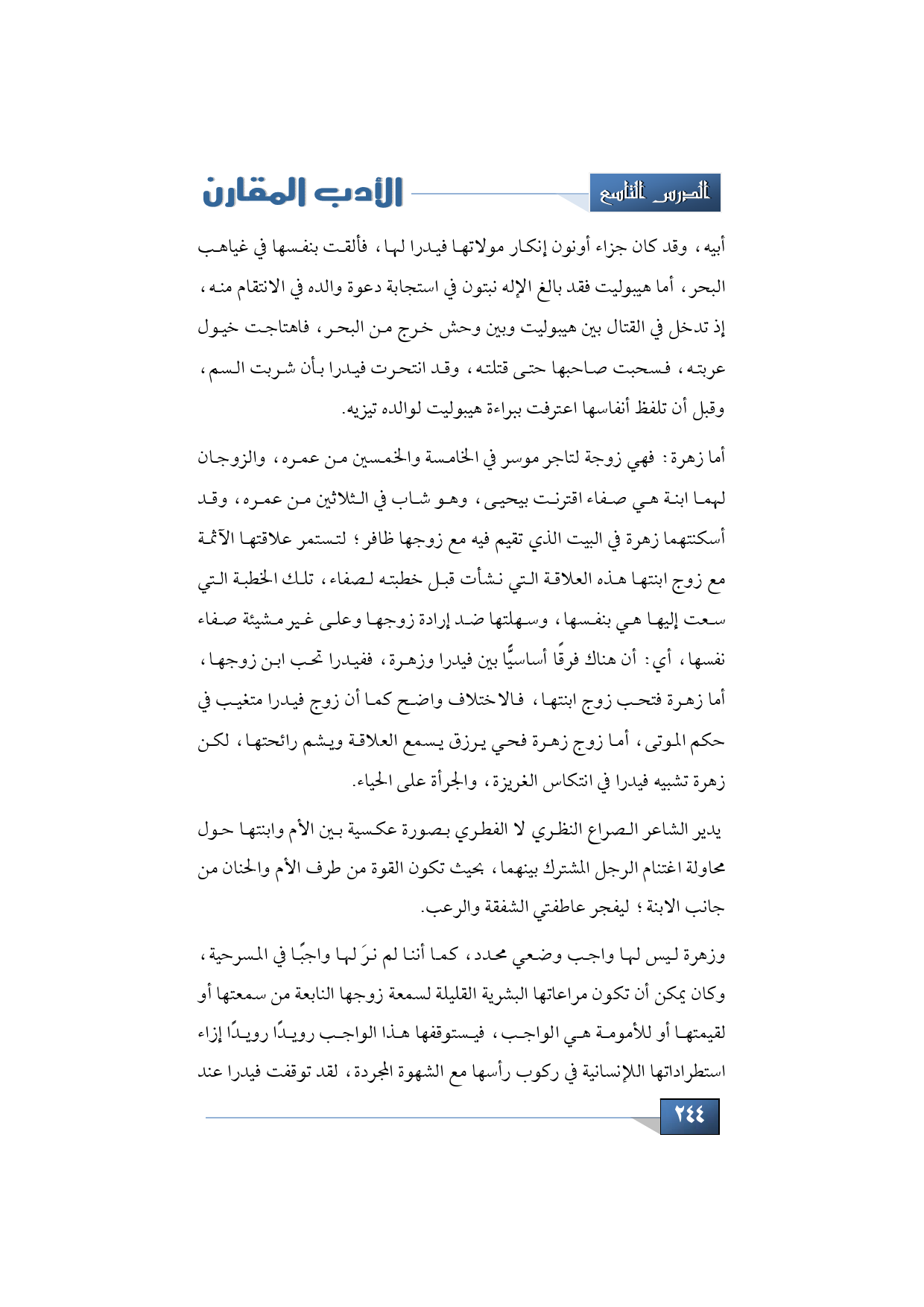 وزهرة ليس لها واجب وضعي محدد، كما أننا لم نرَ لها واجبًا في المسرحية، وكان يمكن أن تكون مراعاتها البشرية القليلة لسمعة زوجها النابعة من سمعتها أو لقيمتها أو للأمومة هي الواجب، فيستوقفها هذا الواجب رويدًا رويدًا إزاء استطراداتها اللإنسانية في ركوب رأسها مع الشهوة المجردة، لقد توقفت فيدرا عند