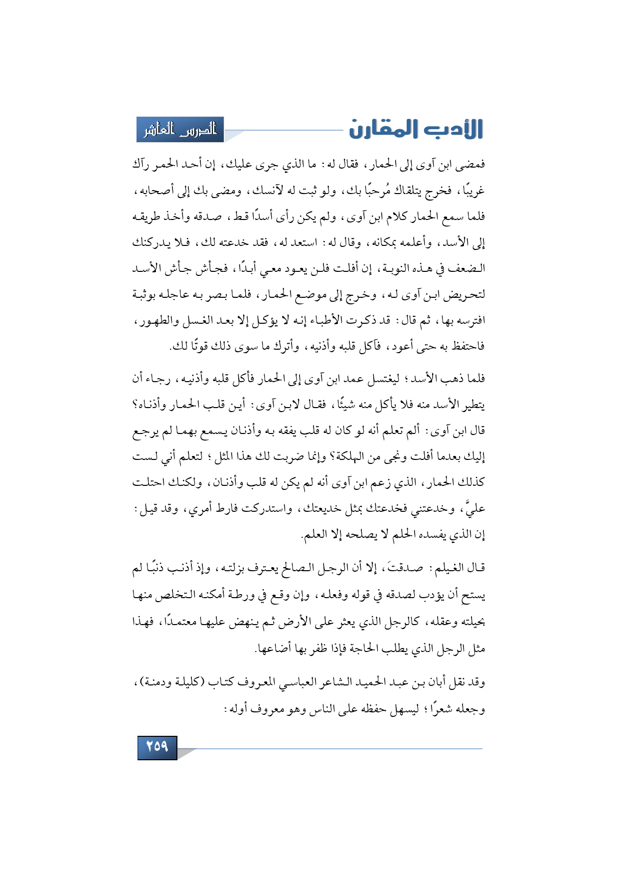 فلما ذهب الأسد؛ ليغتسل عمد ابن آوى إلى الحمار فأكل قلبه وأذنيه، رجاء أن يتطير الأسد منه فلا يأكل منه شيئًا، فقال لابن آوى: أين قلب الحمار وأذناه؟ قال ابن آوى: ألم تعلم أنه لو كان له قلب يفقه به وأذنان يسمع بهما لم يرجع إليك بعدما أفلت ونجى من الهلكة؟ وإنما ضربت لك هذا المثل؛ لتعلم أني لست كذلك الحمار، الذي زعم ابن آوى أنه لم يكن له قلب وأذنان، ولكنك احتلت عليَّ، وخدعتني فخدعتك بمثل خديعتك، واستدركت فارط أمري، وقد قيل: إن الذي يفسده الحلم لا يصلحه إلا العلم.