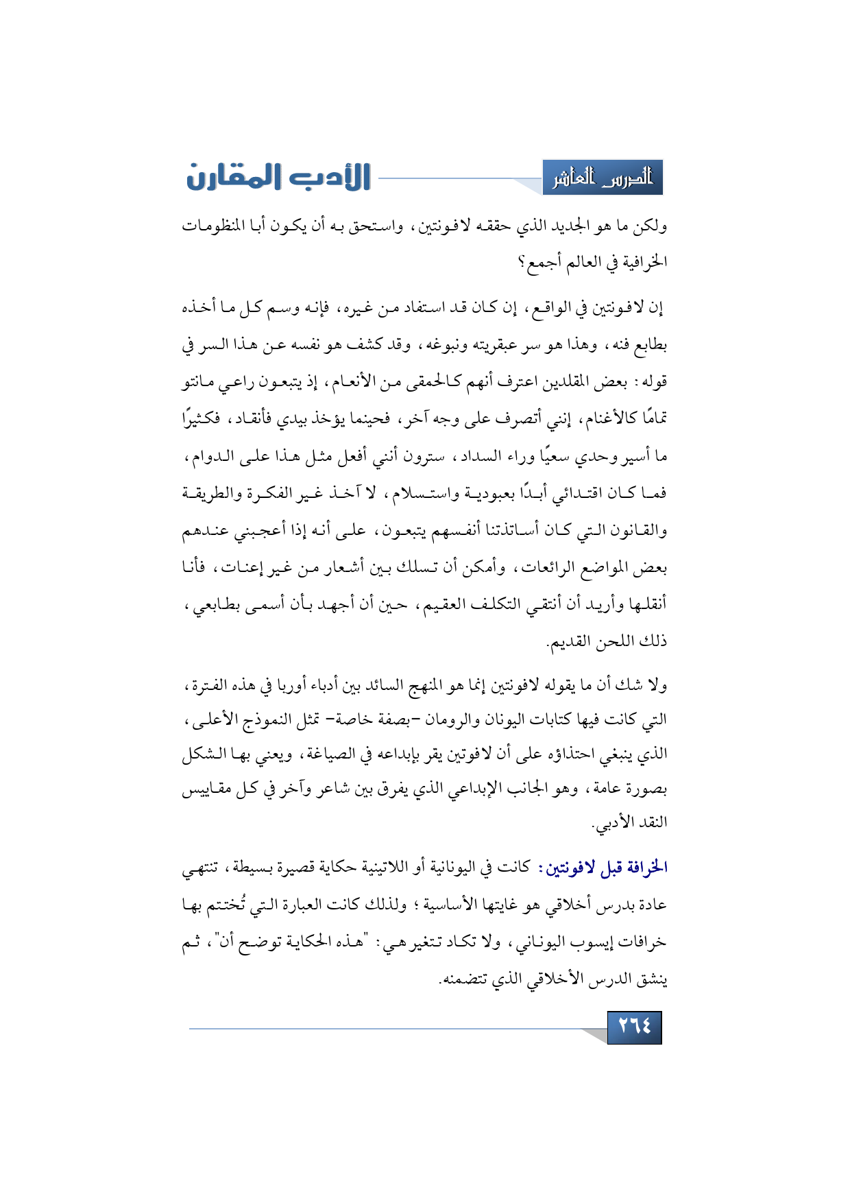 ولا شك أن ما يقوله لافونتين إنما هو المنهج السائد بين أدباء أوربا في هذه الفترة، التي كانت فيها كتابات اليونان والرومان بصفة خاصة تمثل النموذج الأعلى، الذي ينبغي احتذاؤه على أن لافوتين يقر بإبداعه في الصياغة، ويعني بها الشكل بصورة عامة، وهو الجانب الإبداعي الذي يفرق بين شاعر وآخر في كل مقاييس النقل الأدبي، وكانت الخرافة قبل لافونتين في اليونانية أو اللاتينية حكاية قصيرة بسيطة، تنتهي عادة بدرس أخلاقي هو غايتها الأساسية؛ ولذلك كانت العبارة التي تُختتم بها خرافات إيسوب اليوناني، ولا تكاد تتغير هي: "هذه الحكاية توضح أن"، ثم ينشق الدرس الأخلاقي الذي تتضمنه،