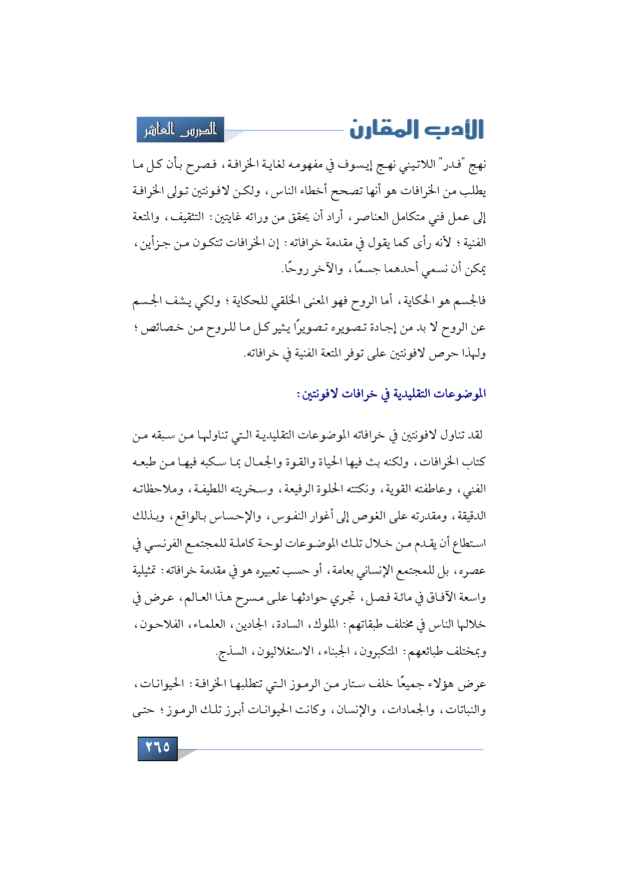فالجسم هو الحكاية، أما الروح فهو المعنى الخلقي للحكاية؛ ولكي يشف الجسم عن الروح لا بد من إجادة تصويره تصويرًا يثير كل ما للروح من خصائص؛ ولهذا حرص لافونتين على توفر المتعة الفنية في خرافاته، لقد تناول لافونتين في خرافاته الموضوعات التقليدية التي تناولها من سبقه من كتاب الخرافات، ولكنه بث فيها الحياة والقوة والجمال بما سكبه فيها من طبعه الفني، وعاطفته القوية، ونكتته الحلوة الرفيعة، وسخريته اللطيفة، وملاحظاته الدقيقة، ومقدرته على الغوص إلى أغوار النفوس، والإحساس بالواقع، وبذلك استطاع أن يقدم من خلال تلك الموضوعات لوحة كاملة للمجتمع الفرنسي في عصره، بل للمجتمع الإنساني بعامة، أو حسب تعبيره هو في مقدمة خرافاته: تمثيلية واسعة الآفاق في مائة فصل، تجري حوادثها على مسرح هذا العالم، عرض في خلالها الناس في مختلف طبقاتهم: الملوك، السادة، الجادين، العلماء، الفلاحون، وبمختلف طبائعهم: المتكبرون، الجبناء، الاستغلاليون، السذج.