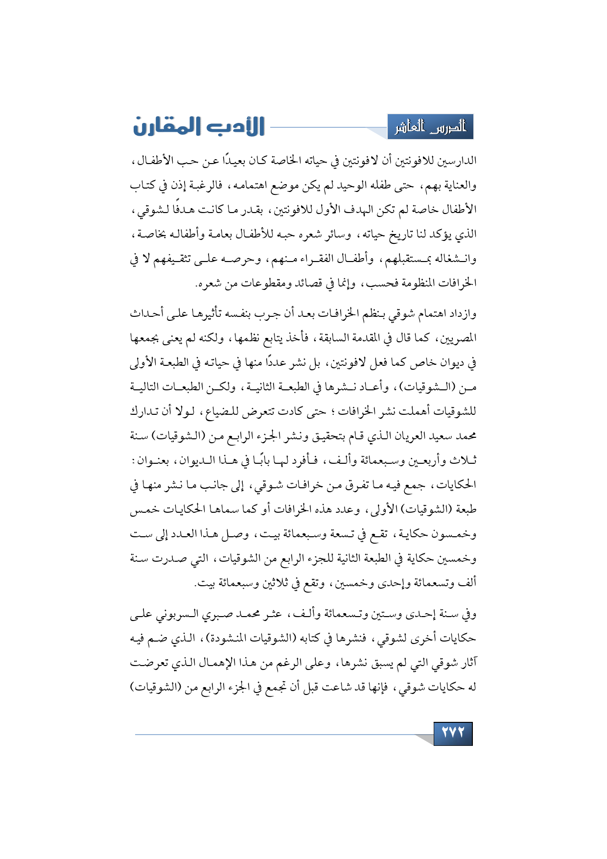 وازداد اهتمام شوقي بنظم الخرافات بعد أن جرب بنفسه تأثيرها على أحداث المصريين، كما قال في المقدمة السابقة، فأخذ يتابع نظمها، ولكنه لم يعنى بجمعها في ديوان خاص كما فعل لافونتين، بل نشر عددًا منها في حياته في الطبعة الأولى من (الشوقيات)، وأعاد نشرها في الطبعة الثانية، ولكن الطبعات التالية للشوقيات أهملت نشر الخرافات؛ حتى كادت تتعرض للضياع لولا أن تدارك محمد سعيد العريان الذي قام بتحقيق ونشر الجزء الرابع من (الشوقيات) سنة ثلاث وأربعين وسبعمائة وألف، فأفرد لها بابًا في هذا الديوان، بعنوان: الحكايات، جمع فيه ما تفرق من خرافات شوقي إلى جانب ما نشر منها في طبعة (الشوقيات) الأولى، وعدد هذه الخرافات أو كما سماها الحكايات خمس وخمسون حكاية، تقع في تسعة وسبعمائة بيت، وصل هذا العدد إلى ست وخمسين حكاية في الطبعة الثانية للجزء الرابع من الشوقيات، التي صدر سنة ألف وتسعمائة وإحدى وخمسين، وتقع في ثلاثين وسبعمائة بيت.