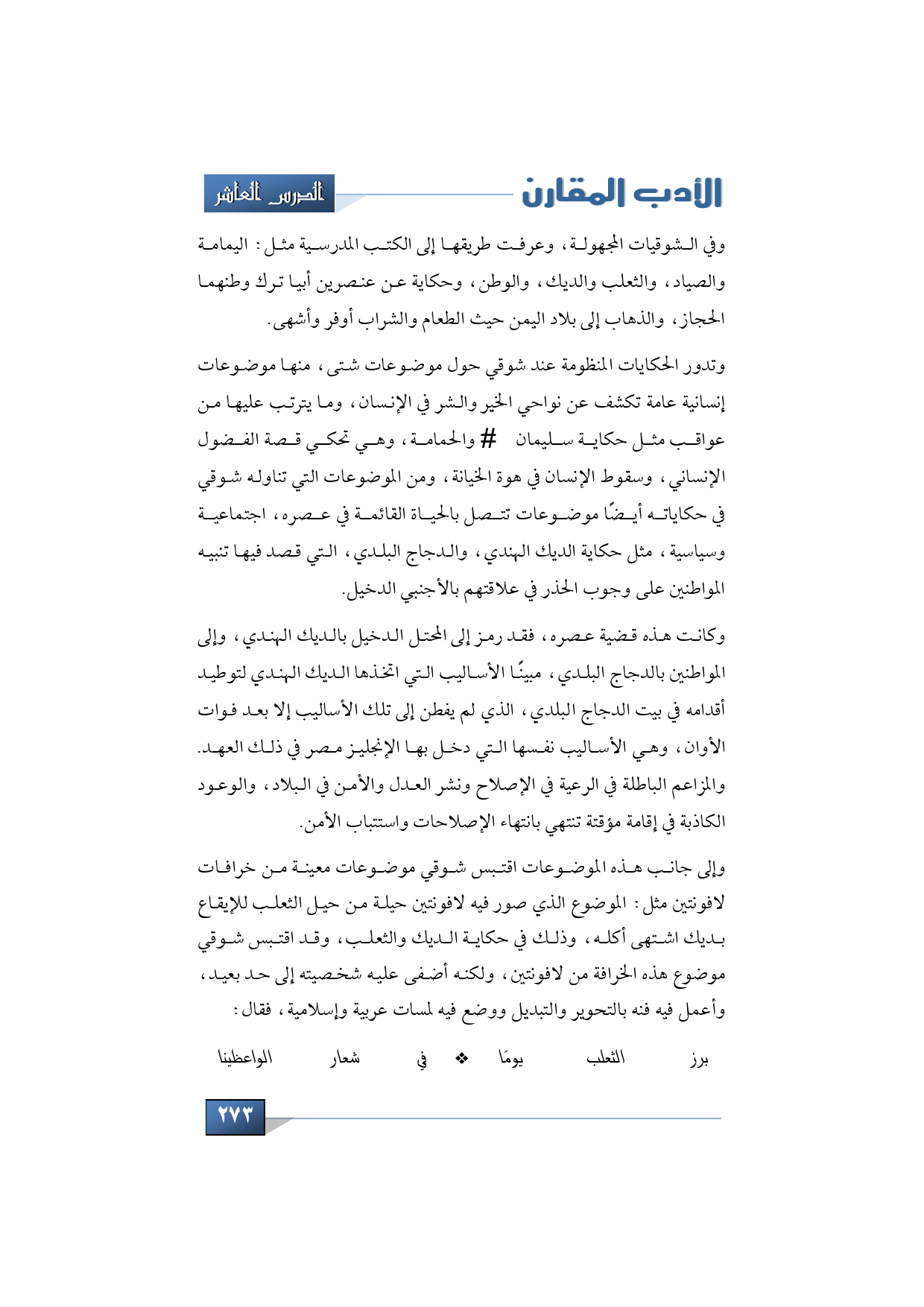 وفي الشوقيات المجهولة، وعرفت طريقها إلى الكتب المدرسية مثل اليمامة والصياد، والثعلب والديك، والوطن، وحكاية عن عنصرين أبيا ترك وطنهما الحجاز، والذهاب إلى بلاد اليمن حيث الطعام والشراب أوفر وأشهى.