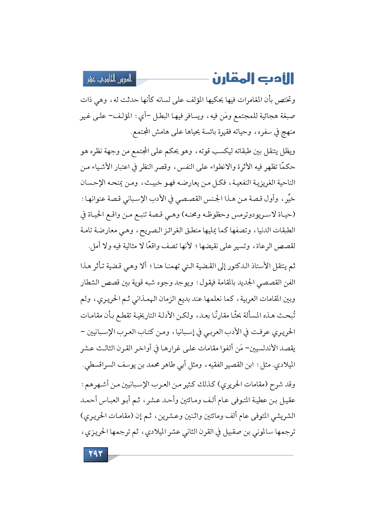 ثم ينتقل الأستاذ الدكتور إلى القضية التي تهمنا هنا؛ ألا وهي قضية تأثر هذا الفن القصصي الجديد بالمقامة فيقول: ويوجد وجوه شبه قوية بين قصص الشطار السابقة الذكر وبين المقامات العربية، كما نعلمها عند بديع الزمان الهمذاني ثم الحريري، ولم تُبحث هذه المسألة بحثًا مقارنًا بعد، ولكن الأدلة التاريخية تقطع بأن مقامات الحريري عرفت في الأدب العربي في إسبانيا، ومن كتاب العرب الإسبانيين -يقصد الأندلسيين- مَن ألفوا مقامات على غرارها في أواخر القرن الثالث عشر الميلادي. مثل: ابن القصير الفقيه، ومثل أبي طاهر محمد بن يوسف السراقسطي.