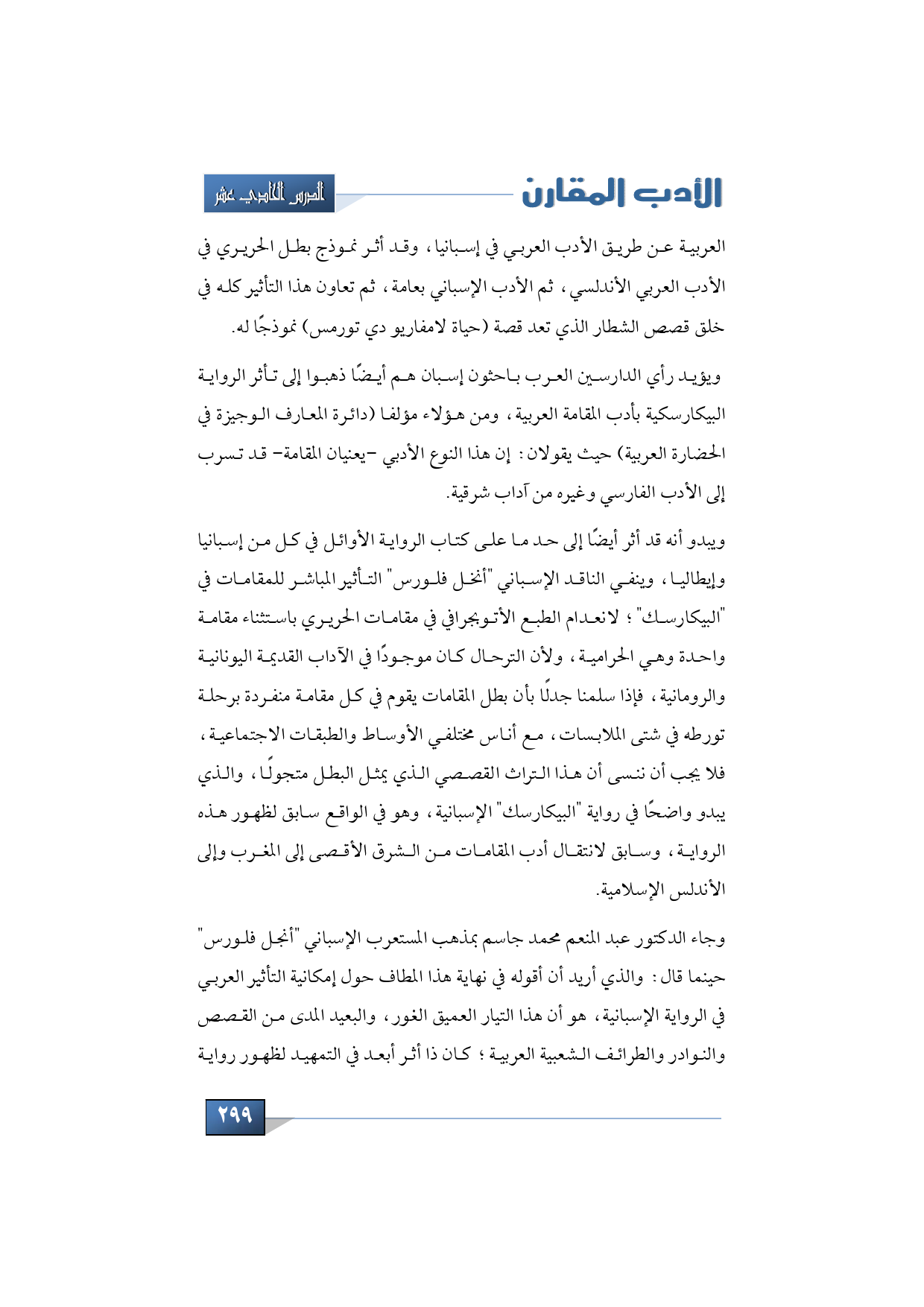 العربية عن طريق الأدب العربي في إسبانيا، وقد أثر نموذج بطل الحريري في الأدب العربي الأندلسي، ثم الأدب الإسباني بعامة، ثم تعاون هذا التأثير كله في خلق قصص الشطار الذي تعد قصة (حياة لامفاريو دي تورمس) نموذجًا له، ويؤيد رأي الدارسين العرب باحثون إسبان هم أيضًا ذهبوا إلى تأثر الرواية البيكارسكية بأدب المقامة العربية، ومن هؤلاء مؤلفا (دائرة المعارف الوجيزة في الحضارة العربية) حيث يقولان: إن هذا النوع الأدبي -يعنيان المقامة- قد تسرب إلى الأدب الفارسي وغيره من آداب شرقية.
