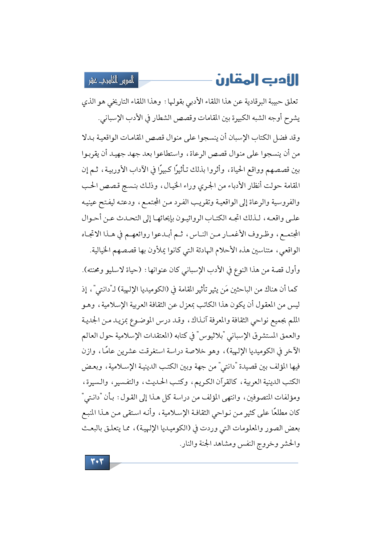 وأول قصة من هذا النوع في الأدب الإسباني كان عنوانها (حياة لاسليو ومحنته) كما أن هناك من الباحثين مَن يثير تأثير المقامة في (الكوميديا الإلهية) لـ"دانتي"، إذ ليس من المعقول أن يكون هذا الكاتب بمعزل عن الثقافة العربية الإسلامية، وهو الملم بجميع نواحي الثقافة والمعرفة آنذاك، وقد درس الموضوع بمزيد من الجدية والعمق المستشرق الإسباني "بلاثيوس" في كتابه (المعتقدات الإسلامية حول العالم الآخر في الكوميديا الإلهية) وهو خلاصة دراسة استغرقت عشرين عامًا، وازن فيها المؤلف بين قصيدة "دانتي" من جهة وبين الكتب الدينية الإسلامية، وبعض الكتب الدينية العربية كالقرآن الكريم وكتب الحديث والتفسير والسيرة ومؤلفات المتصوفين، وانتهى المؤلف من دراسة كل هذا إلى القول بأن "دانتي" كان مطلعًا على كثير من نواحي الثقافة الإسلامية، وأنه استقى من هذا المنبع بعض الصور والمعلومات التي وردت في (الكوميديا الإلهية)، مما يتعلق بالبعث والحشر وخروج النفس ومشاهد الجنة والنار.