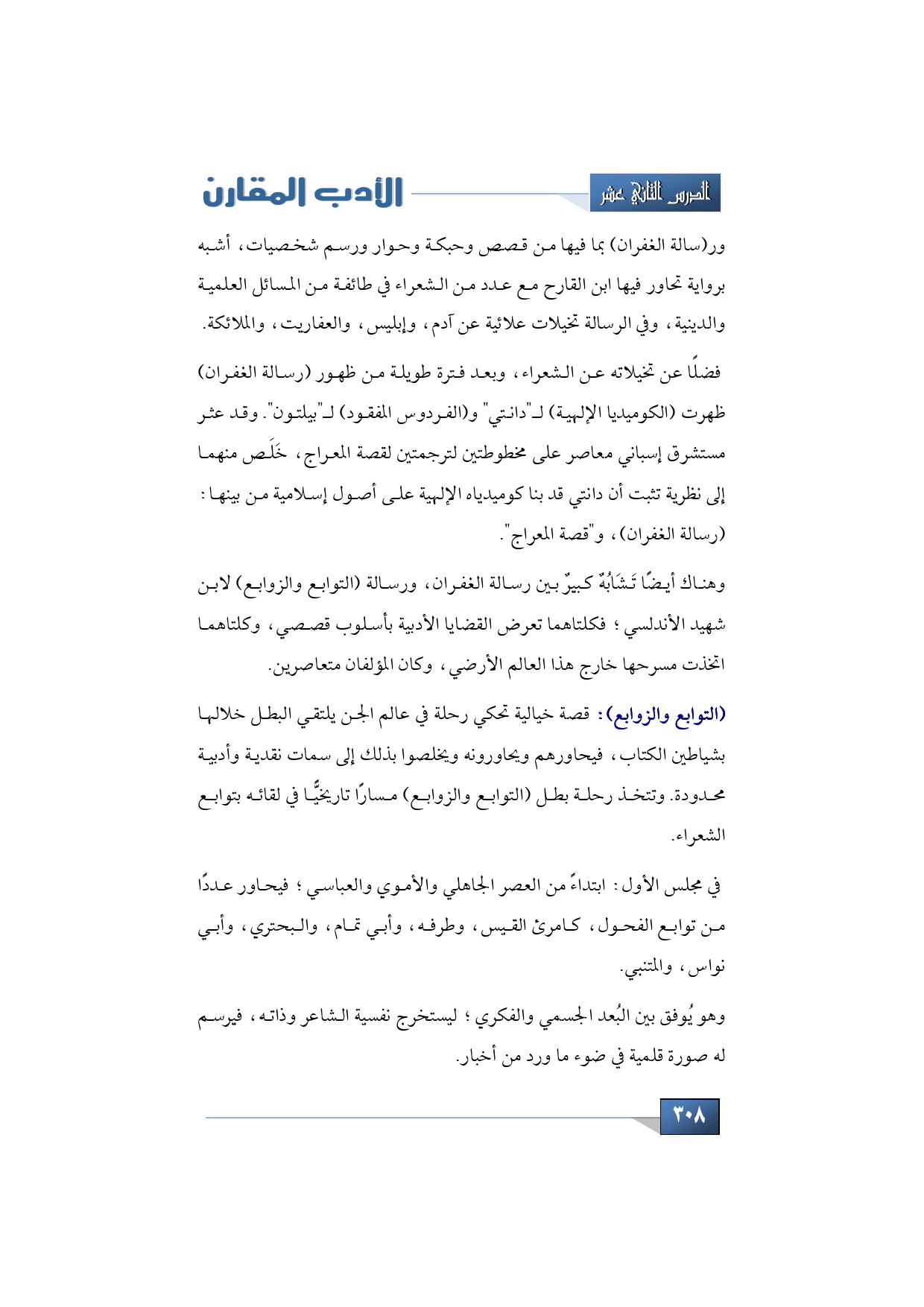 ور (سالة الغفران) بما فيها من قصص وحبكة وحوار ورسم شخصيات، أشبه برواية تحاور فيها ابن القارح مع عدد من الشعراء في طائفة من المسائل العلمية والدينية، وفي الرسالة تخيلات علائية عن آدم، وإبليس، والعفاريت، والملائكة. فضلًا عن تخيلاته عن الشعراء، وبعد فترة طويلة من ظهور (رسالة الغفران) ظهرت (الكوميديا الإلهية) لـ"دانتي" و (الفردوس المفقود) لـ"بيلتون". وقد عثر مستشرق إسباني معاصر على مخطوطتين لترجمتين لقصة المعراج، خَلَص منهما إلى نظرية تثبت أن دانتي قد بنا كوميدياه الإلهية على أصول إسلامية من بينها (رسالة الغفران) و"قصة المعراج".