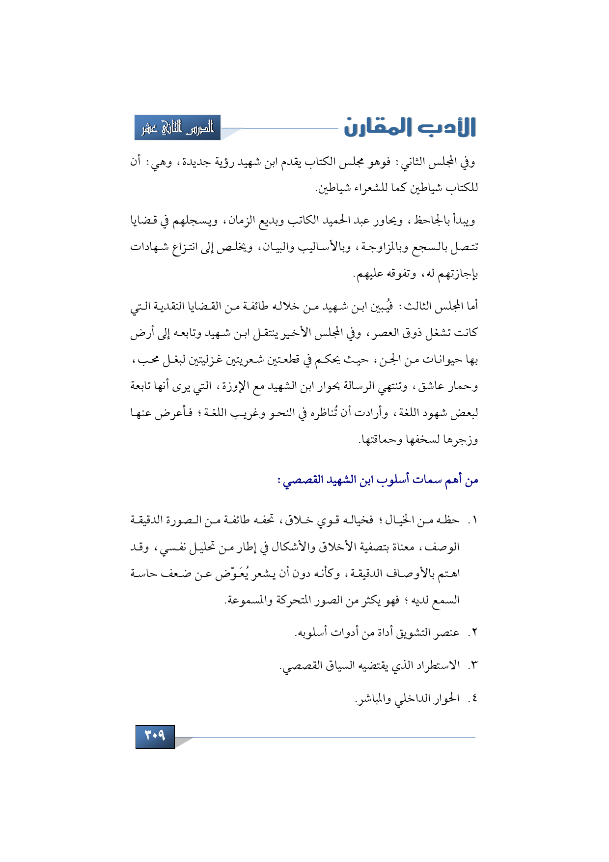 وفي المجلس الثاني وهو مجلس الكتاب يقدم ابن شهيد رؤية جديدة، وهي أن للكتاب شياطين كما للشعراء شياطين. ويبدأ بالجاحظ، ويحاور عبد الحميد الكاتب وبديع الزمان، ويسجلهم في قضايا تتصل بالسجع وبالمزاوجة، وبالأساليب والبيان، ويخلص إلى انتزاع شهادات بإجازتهم له، وتفوقه عليهم.