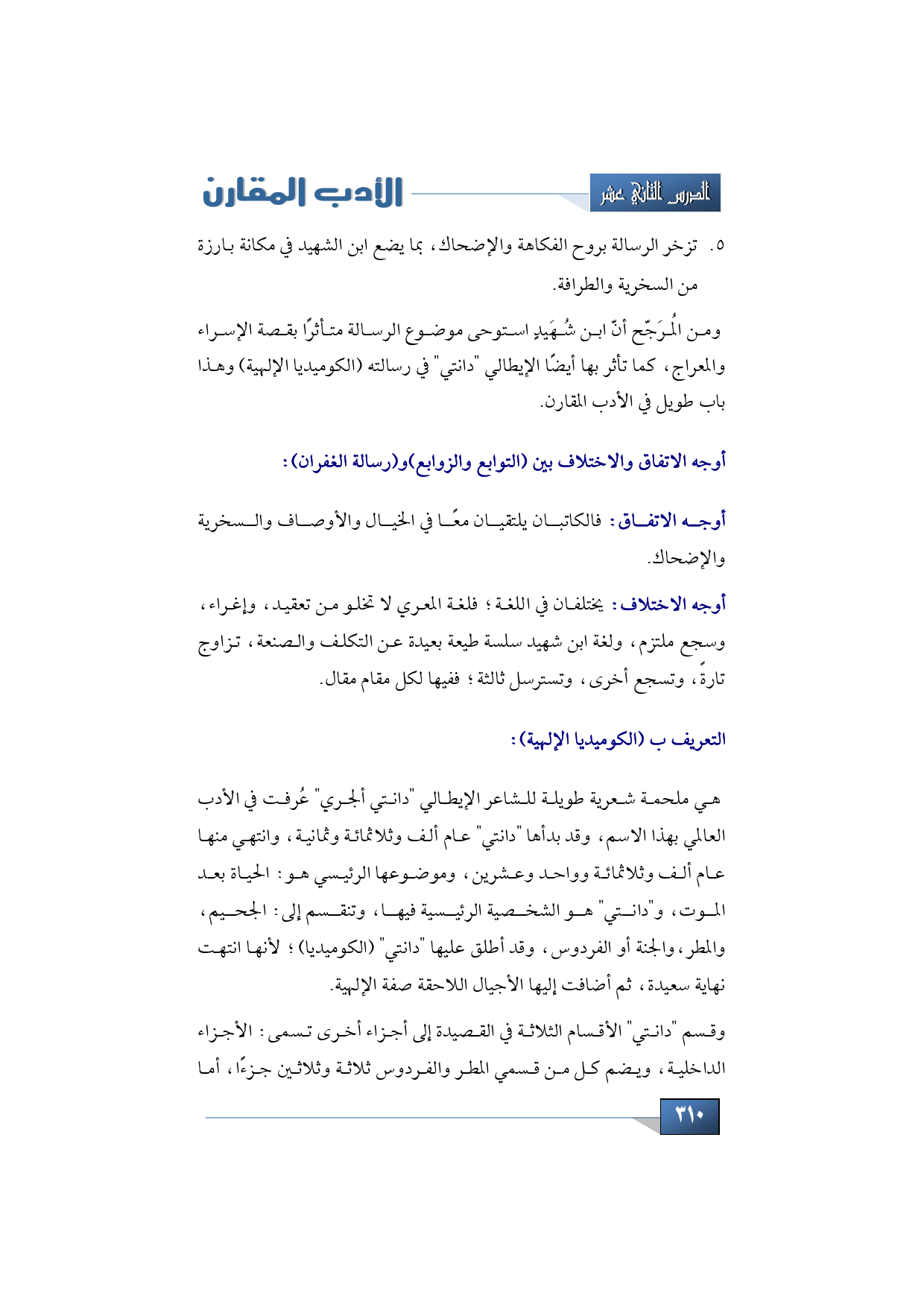 وهُنا يَنبغي أن نقول كلمة عن (الكوميديا الإلهية)؛ فهي ملحمة شعرية طويلة للشاعر الإيطالي "دانتي ألجري" عُرفت في الأدب العالمي بهذا الاسم، وقد بدأها "دانتي" عام ألف وثلاثمائة وثمانية، وانتهي منها عام ألف وثلاثمائة وواحد وعشرين، وموضوعها الرئيسي هو الحياة بعد الموت، و"دانتي" هو الشخصية الرئيسية فيها، وتنقسم إلى الجحيم المطر والجنة أو الفردوس، وقد أطلق عليها "دانتي" (الكوميديا) لأنها انتهت نهاية سعيدة، ثم أضافت إليها الأجيال اللاحقة صفة الإلهية.