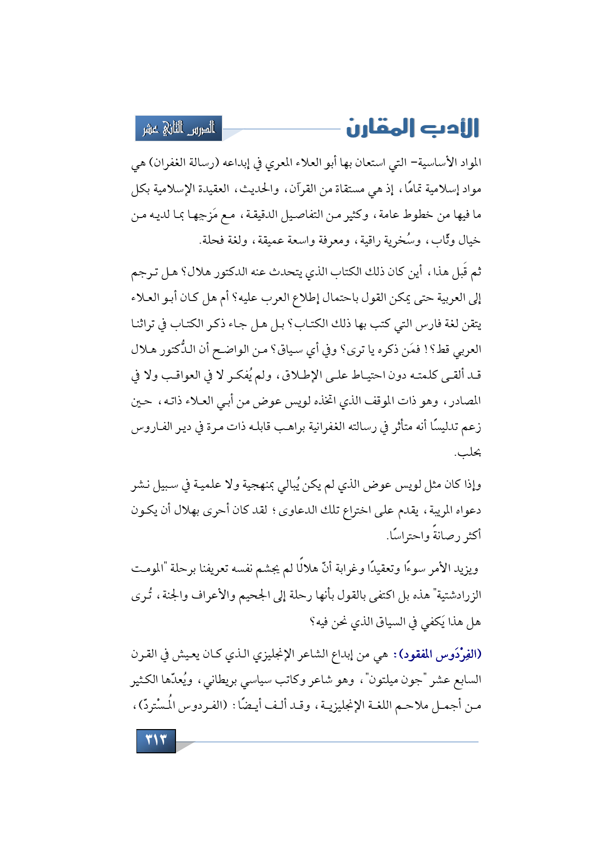 وإذا كان مثل لويس عوض الذي لم يكن يُبالي بمنهجية ولا علمية في سبيل نشر دعواه المريبة، يقدم على اختراع تلك الدعاوى؛ لقد كان أحرى بهلال أن يكون أكثر رصانةً واحتراسًا. ويزيد الأمر سوءًا وتعقيدًا وغرابة أنّ هلالًا لم يجشم نفسه تعريفنا برحلة "المومت الزرادشتية" هذه بل اكتفى بالقول بأنها رحلة إلى الجحيم والأعراف والجنة، تُرى هل هذا يَكفي في السياق الذي نحن فيه؟