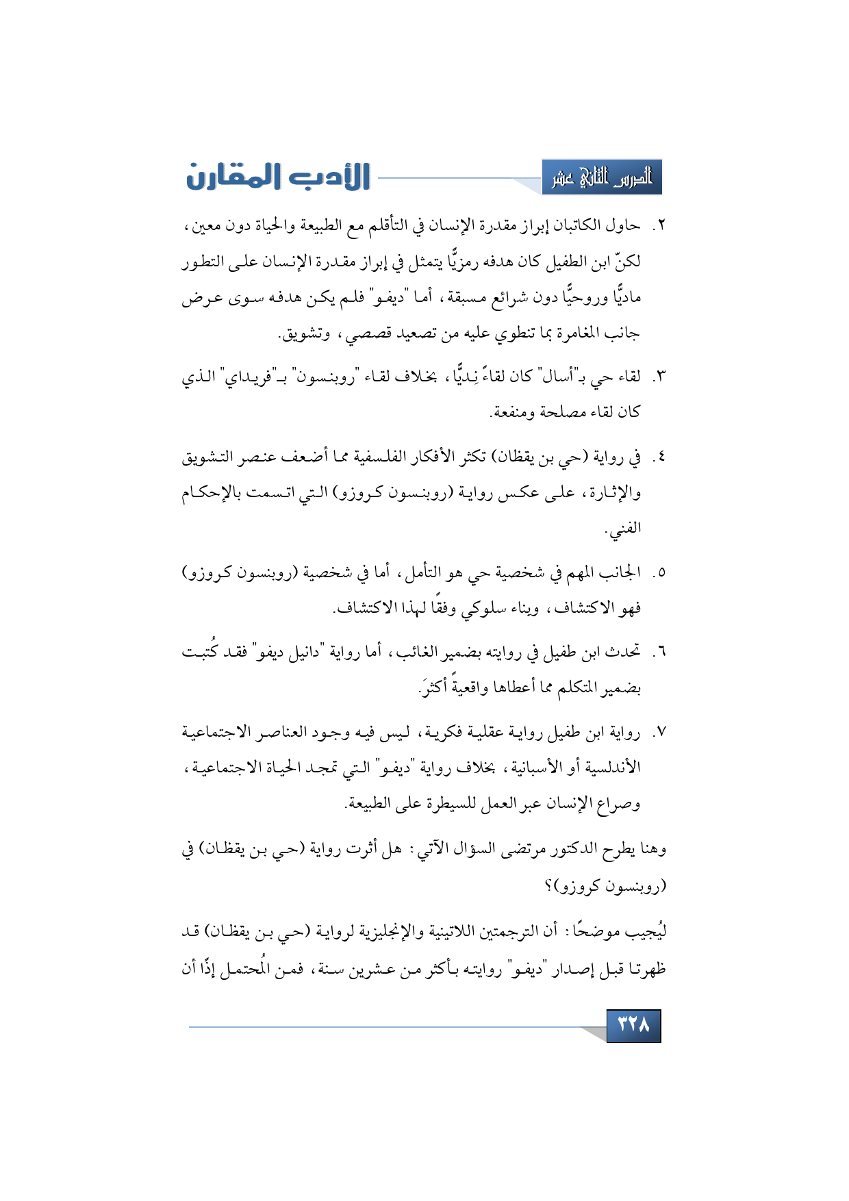 4 - في رواية (حي بن يقظان) تكثر الأفكار الفلسفية مما أضعف عنصر التشويق والإثارة على عكس رواية (روبنسون كروزو) التي اتسمت بالإحكام الفني.