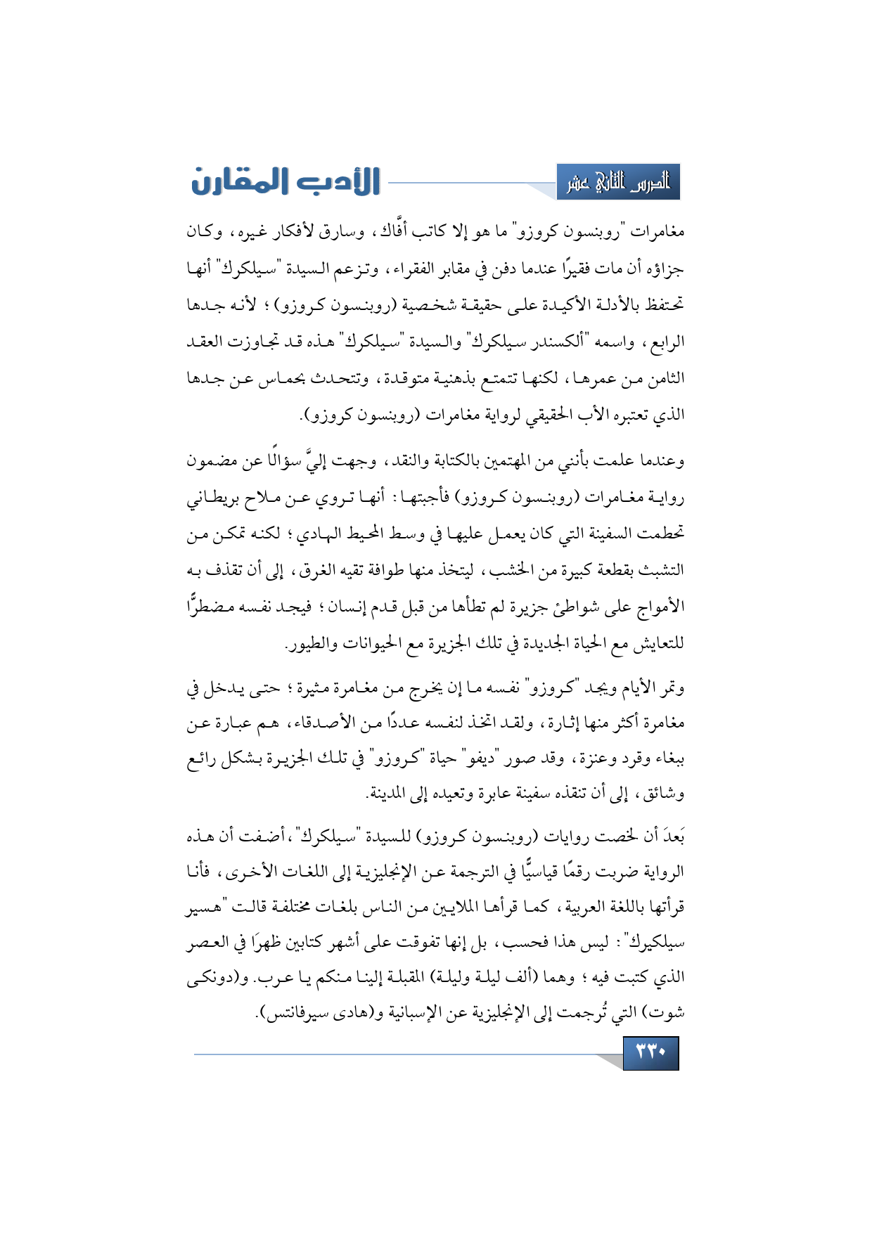 بَعدَ أن لخصت روايات (روبنسون كروزو) للسيدة "سيلكرك" أضفت أن هذه الرواية ضربت رقمًا قياسيًّا في الترجمة عن الإنجليزية إلى اللغات الأخرى، فأنا مثلًا قرأتها باللغة العربية، كما قرأها الملايين من الناس بلغات مختلفة قالت "هسير سيلكيرك": ليس هذا فحسب، بل إنها تفوقت على أشهر كتابين ظهرَا في العصر الذي كتبت فيه؛ وهما (ألف ليلة وليلة) المقبلة إلينا منكم يا عرب. و (دونكى شوت) التي تُرجمت إلى الإنجليزية عن الإسبانية و (هادى سيرفانتس).