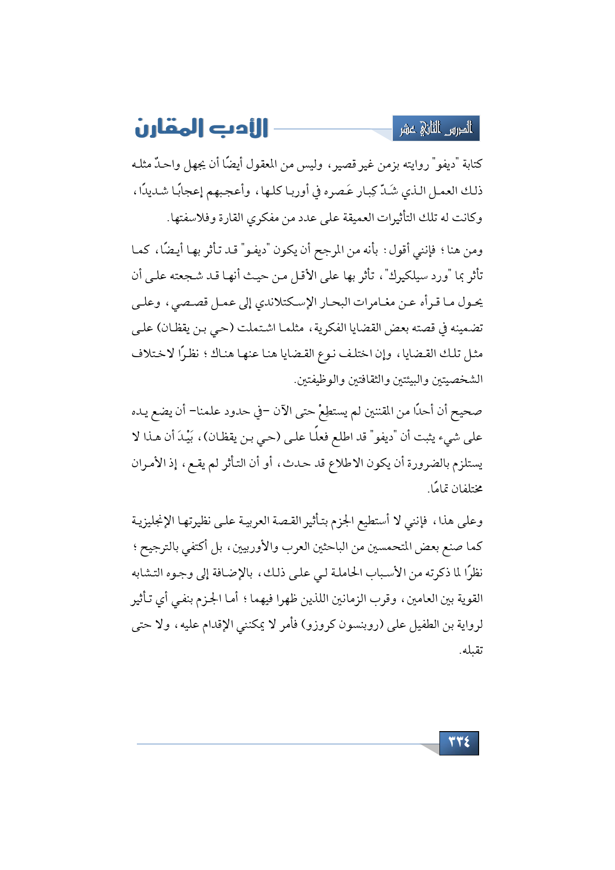 وعلى هذا، فإنني لا أستطيع الجزم بتأثير القصة العربية على نظيرتها الإنجليزية كما صنع بعض المتحمسين من الباحثين العرب والأوربيين، بل أكتفي بالترجيح؛ نظرًا لما ذكرته من الأسباب الحاملة لي على ذلك، بالإضافة إلى وجوه التشابه القوية بين العامين، وقرب الزمانين اللذين ظهرا فيهما؛ أما الجزم بنفي أي تأثير لرواية بن الطفيل على (روبنسون كروزو) فأمر لا يمكنني الإقدام عليه، ولا حتى تقبله.
