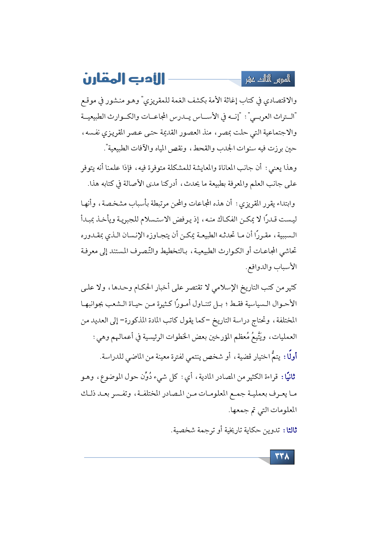 والاقتصادي في كتاب إغاثة الأمة بكشف الغمة للمقريزي" وهو منشور في موقع "التراث العربي": "إنه في الأساس يدرس المجاعات والكوارث الطبيعية والاجتماعية التي حلت بمصر، منذ العصور القديمة حتى عصر المقريزي نفسه، حين برزت فيه سنوات الجدب والقحط، ونقص المياه والآفات الطبيعية".