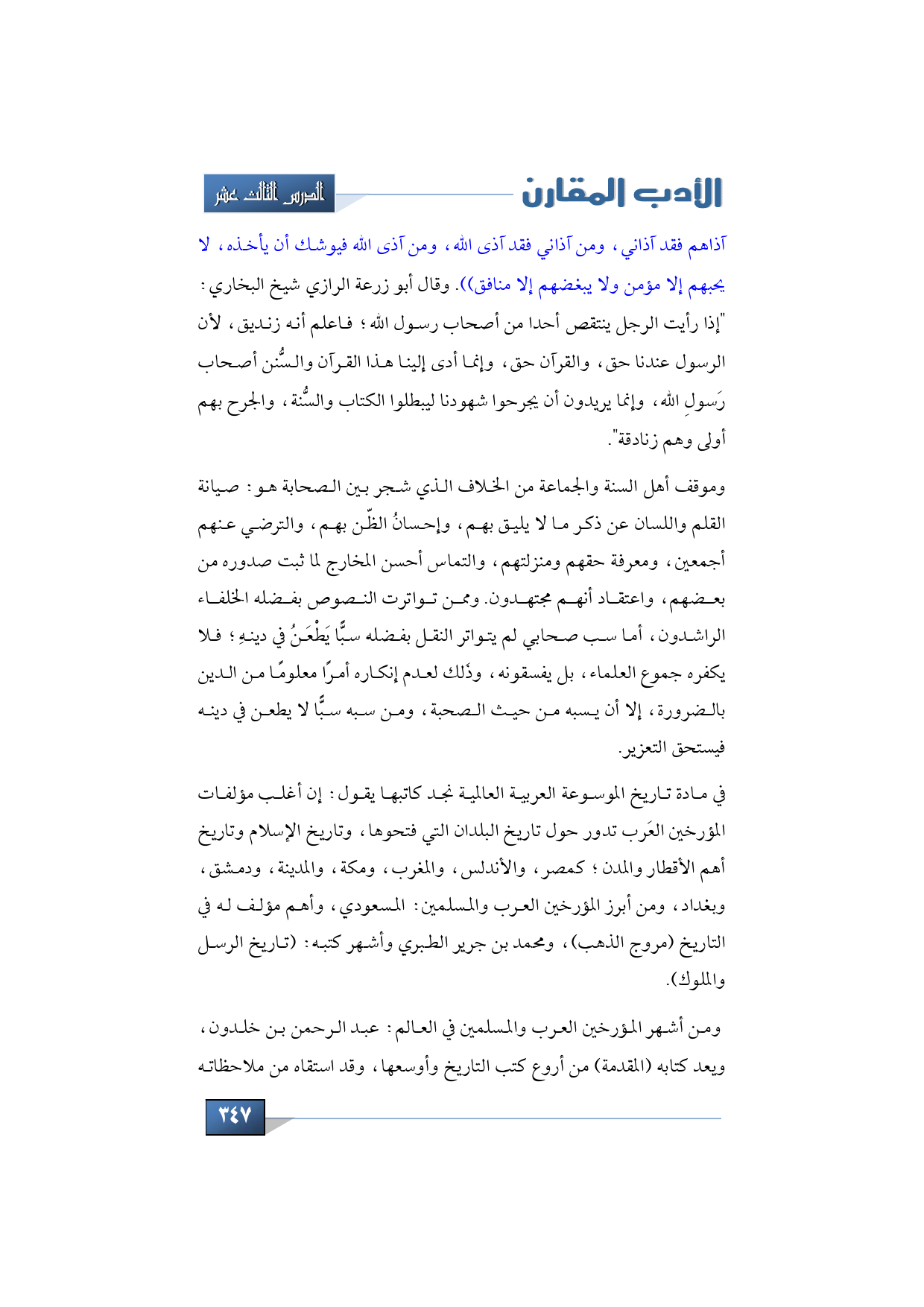 آذاهم فقد آذاني، ومن آذاني فقد آذى الله ومن آذى الله فيوشك أن يأخذه، لا يحبهم إلا مؤمن ولا يبغضهم إلا منافق)). وقال أبو زرعة الرازي شيخ البخاري: "إذا رأيت الرجل ينتقص أحدا من أصحاب رسول الله؛ فاعلم أنه زنديق، لأن الرسول عندنا حق، والقرآن حق، وإنما أدى إلينا هذا القرآن والسُّنن أصحاب رَسولِ الله، وإنما يريدون أن يجرحوا شهودنا ليبطلوا الكتاب والسُّنة، والجرح بهم أولى وهم زنادقة".