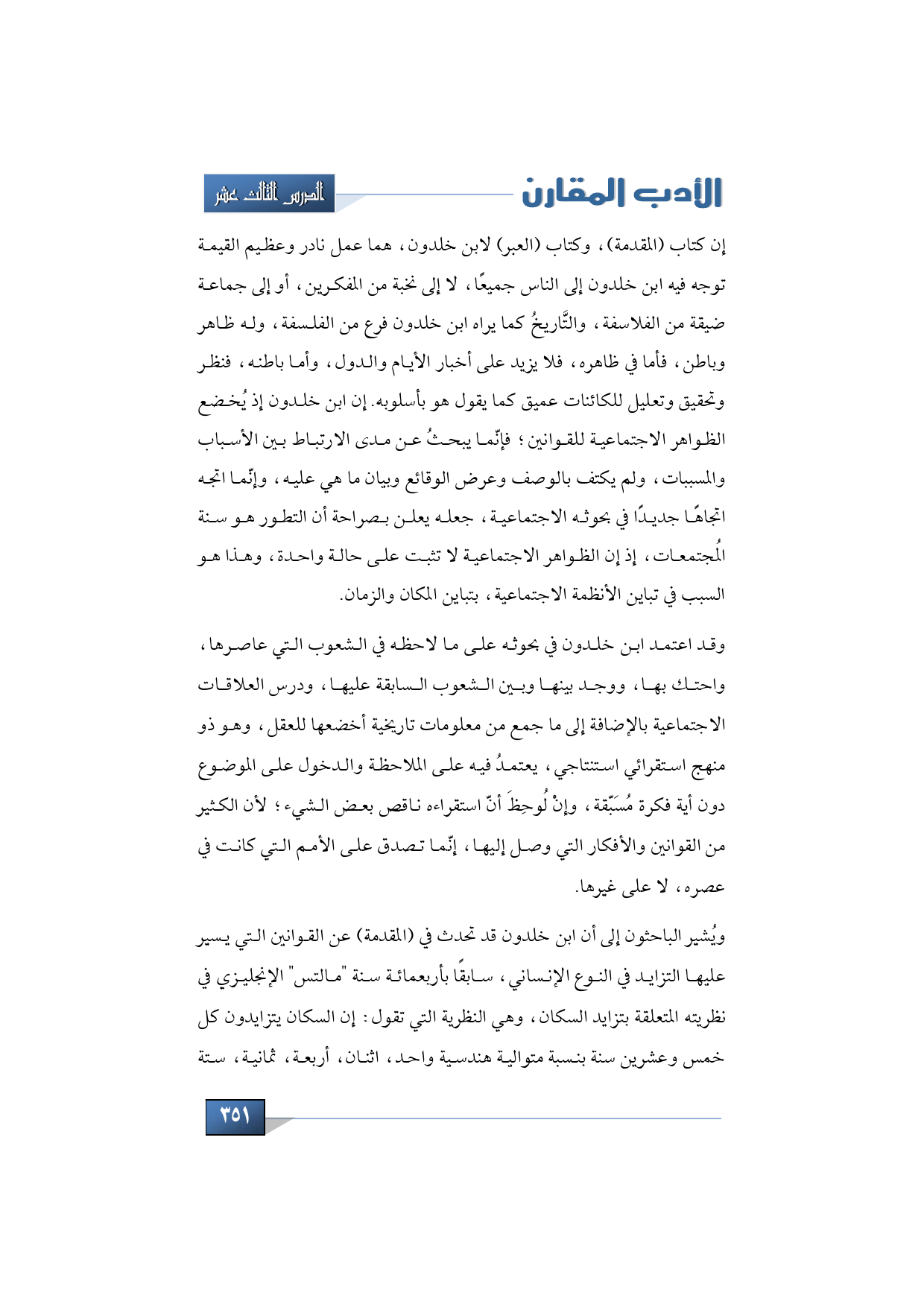 ويُشير الباحثون إلى أن ابن خلدون قد تحدث في (المقدمة) عن القوانين التي يسير عليها التزايد في النوع الإنساني، سابقًا بأربعمائة سنة "مالتس" الإنجليزي في نظريته المتعلقة بتزايد السكان، وهي النظرية التي تقول: إن السكان يتزايدون كل خمس وعشرين سنة بنسبة متوالية هندسية واحد اثنان أربعة ثمانية ستة