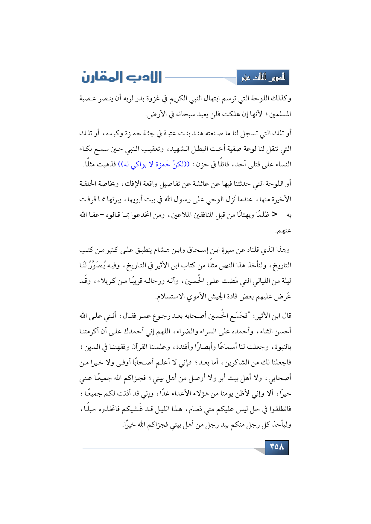 وكذلك اللوحة التي ترسم ابتهال النبي الكريم في غزوة بدر لربه أن ينصر عصبة المسلمين؛ لأنها إن هلكت فلن يعبد سبحانه في الأرض. أو تلك التي تسجل لنا ما صنعته هند بنت عتبة في جثة حمزة وكبده، أو تلك التي تنقل لنا لوعة صفية أخت البطل الشهيد، وتعقيب النبي حين سمع بكاء النساء على قتلى أحد، قائلًا في حزن: ((لكنّ حَمزة لا بواكي له)) فذهبت مثلًا.