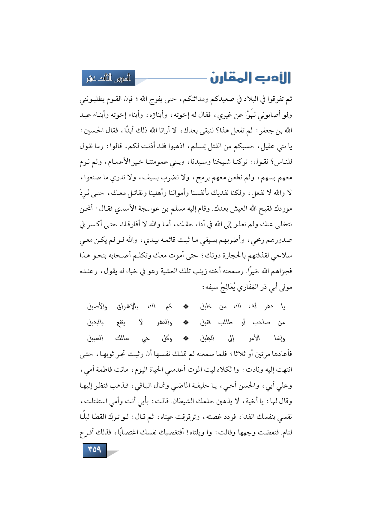 فأعادها مرتين أو ثلاثا؛ فلما سمعته لم تملك نفسها أن وثبت تجر ثوبها، حتى انتهت إليه ونادت: وا ثكلاه ليت الموت أعدمني الحياة اليوم، ماتت فاطمة أمي، وعلي أبي، والحسن أخي، يا خليفة الماضي وثمال الباقي، فذهب فنظر إليها وقال لها: يا أخية، لا يذهبن حلمك الشيطان. قالت: بأبي أنت وأمي استقتلت، نفسي بنفسك الفدا فردد غصته وترقرقت عيناه ثم قال: لو ترك القطا ليلًا لنام. فنفضت وجهها وقالت: وا ويلتاه! أفتغصبك نفسك اغتصابًا، فذلك أقرح