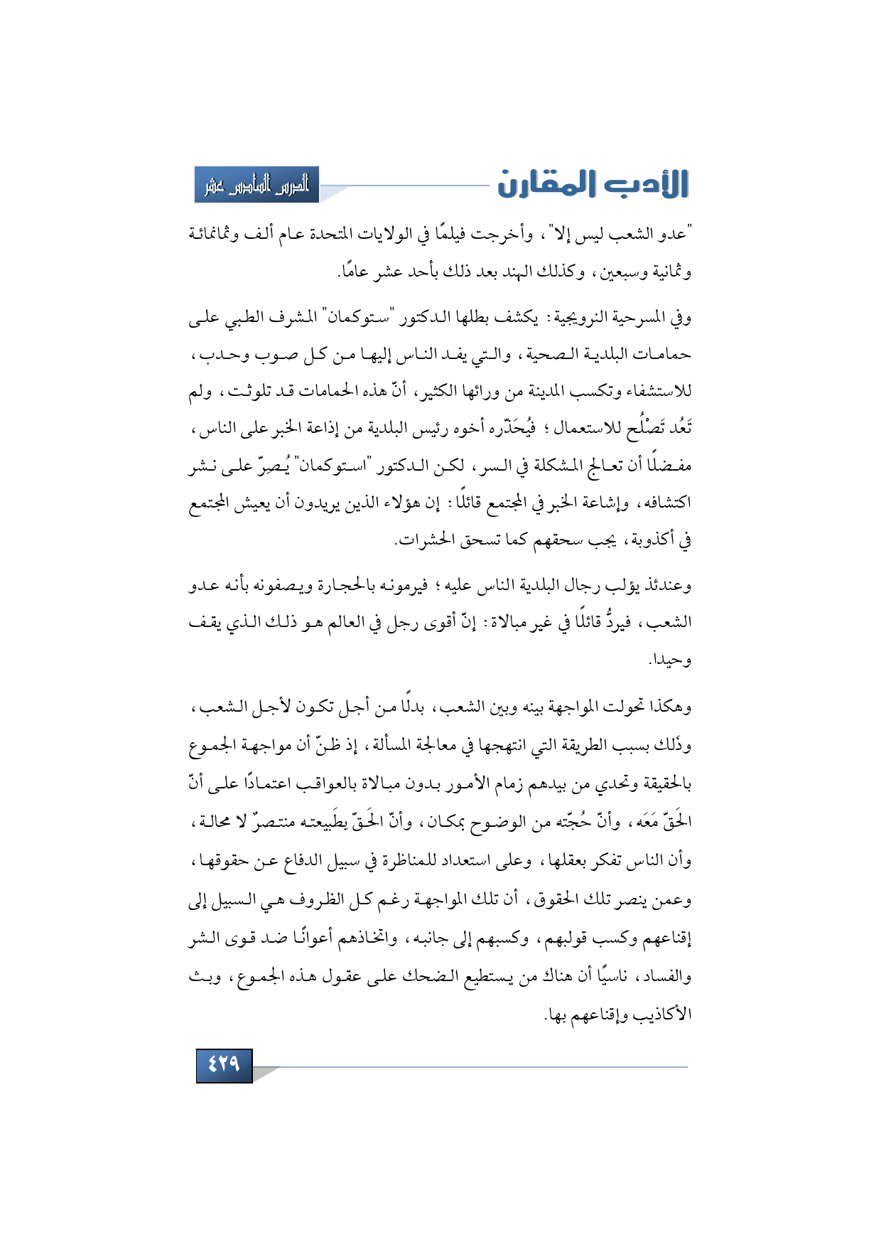 وفي المسرحية النرويجية يكشف بطلها الدكتور "ستوكمان" المشرف الطبي على حمامات البلدية الصحية التي يفد الناس إليها من كل صوب وحدب، للاستشفاء وتكسب المدينة من ورائها الكثير، أنّ هذه الحمامات قد تلوثت، ولم تَعُد تَصْلُح للاستعمال؛ فيُحَذّره أخوه رئيس البلدية من إذاعة الخبر على الناس، مفضلًا أن تعالج المشكلة في السر، لكن الدكتور "استوكمان" يُصِرّ على نشر اكتشافه، وإشاعة الخبر في المجتمع قائلًا: إن هؤلاء الذين يريدون أن يعيش المجتمع في أكذوبة، يجب سحقهم كما تسحق الحشرات.