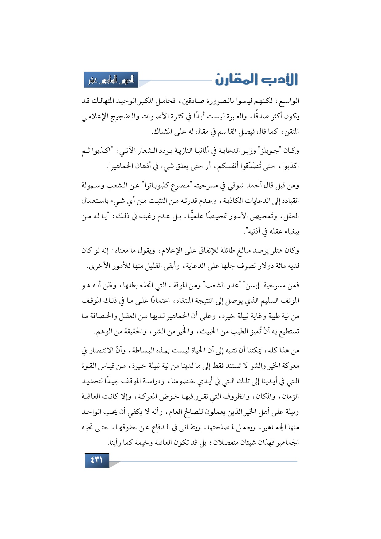 الواسع، لكنهم ليسوا بالضرورة صادقين، فحامل المكبر الوحيد المتهالك قد يكون أكثر صدقًا، والعبرة ليست أبدًا في كثرة الأصوات والضجيج الإعلامي المتقن، كما قال فيصل القاسم في مقال له على المشباك.